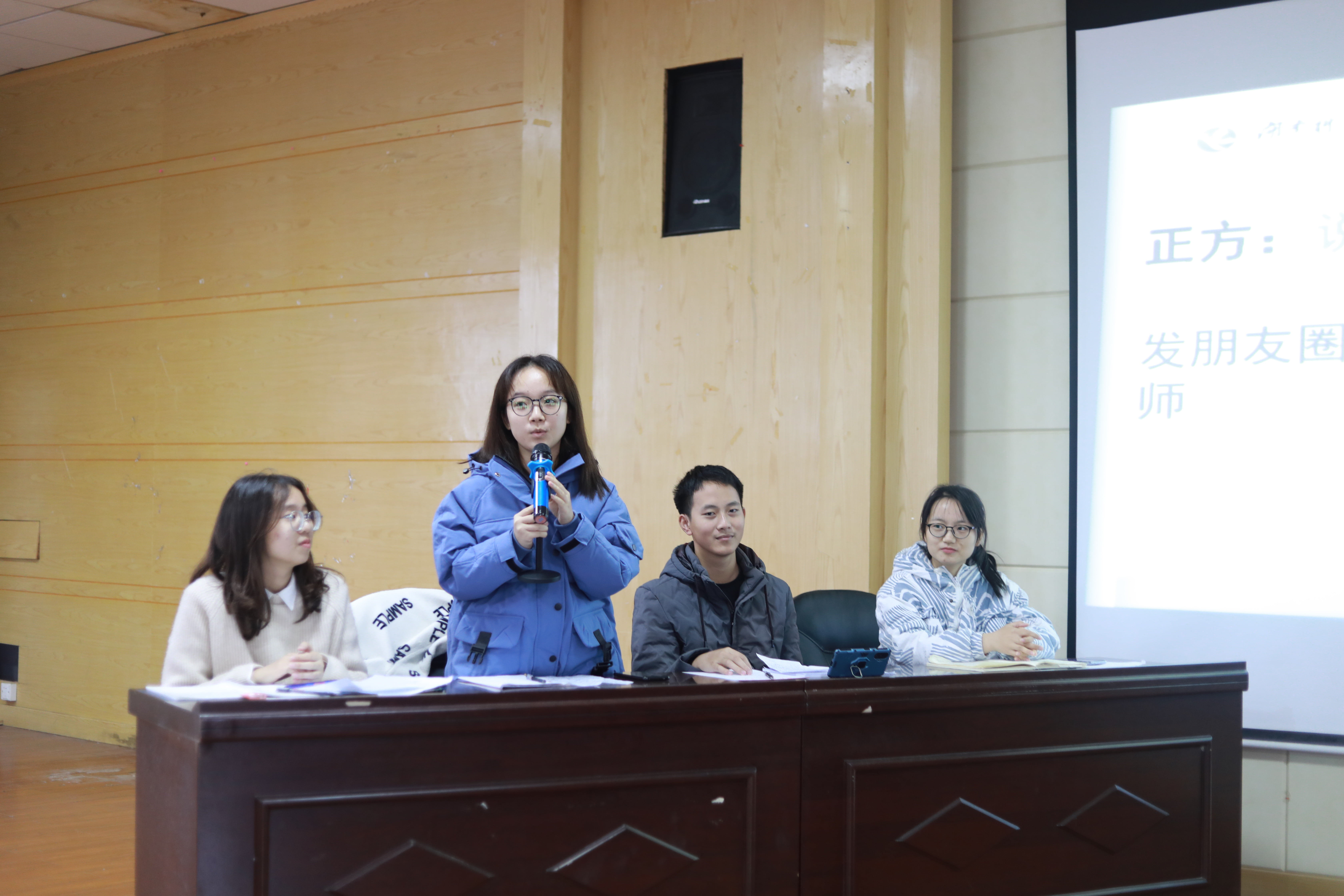 本网讯(记者 周灵敏、王婧)“朋友圈是我们分享生活的平台。”11月7日,马克思主义学院于致远楼701教室举办辩论赛。本次辩论赛围绕“朋友圈是否该屏蔽老师” 这一主题展开。思政2019级晏铭智、思政2020级戴雅兰、黄晓慧、肖羽四名同学担任本次辩论赛的评委,21级学生参加。