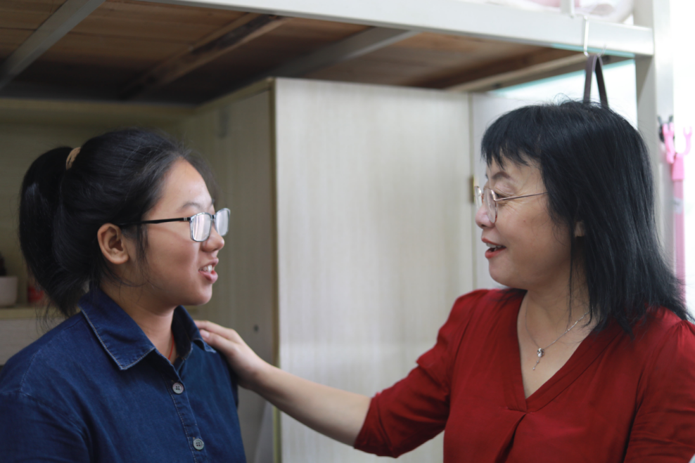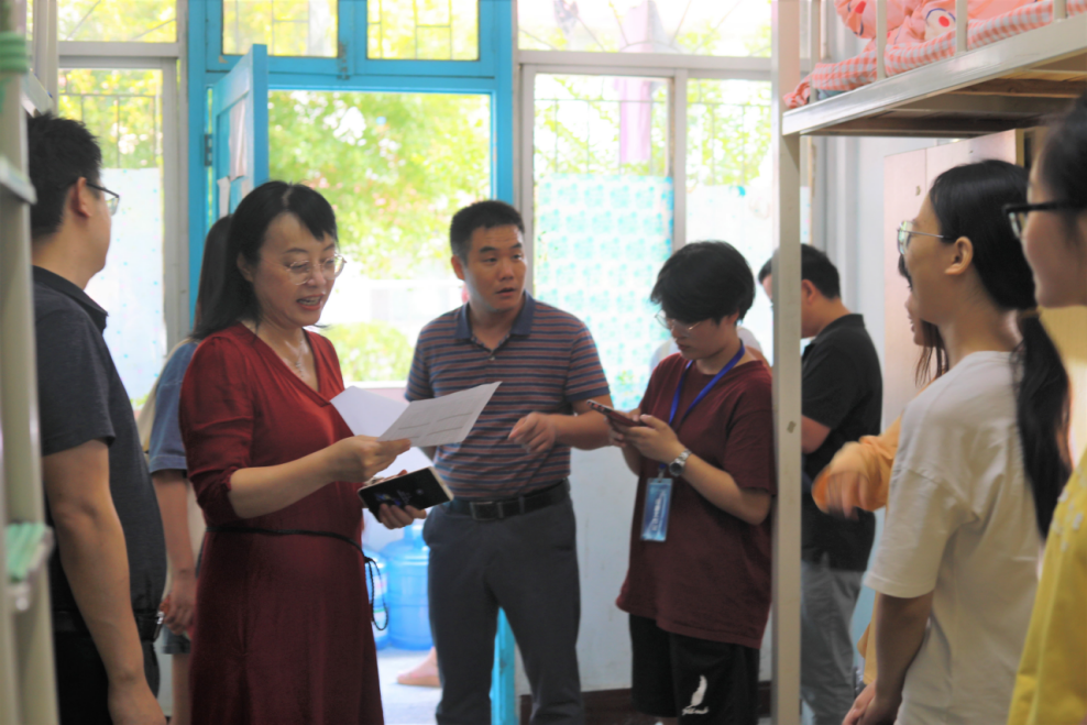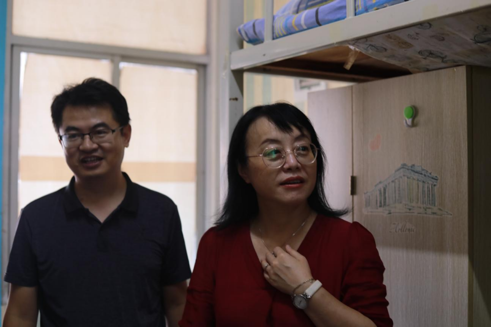 “家是哪里的?”、“生活用品都准备齐全了吗?”、“吃饭、住宿都还习惯吗?”廖雅琴、郑向晖、高丹等来到每间新生寝室与新生亲切交谈,详细了解了新生入学后在住宿、生活方面的情况。在荷园二栋403寝室,来自河北省邯郸的陈晓佳同学在妈妈的陪同下,坐了十几个小时火车才来到学校。廖雅琴院长拉着陈晓佳同学妈妈的手暖心地说:“您一路辛苦了,您放心的把晓佳交给我们,我们这里的每位老师都会像对待自己的孩子一样对待她关心她。”