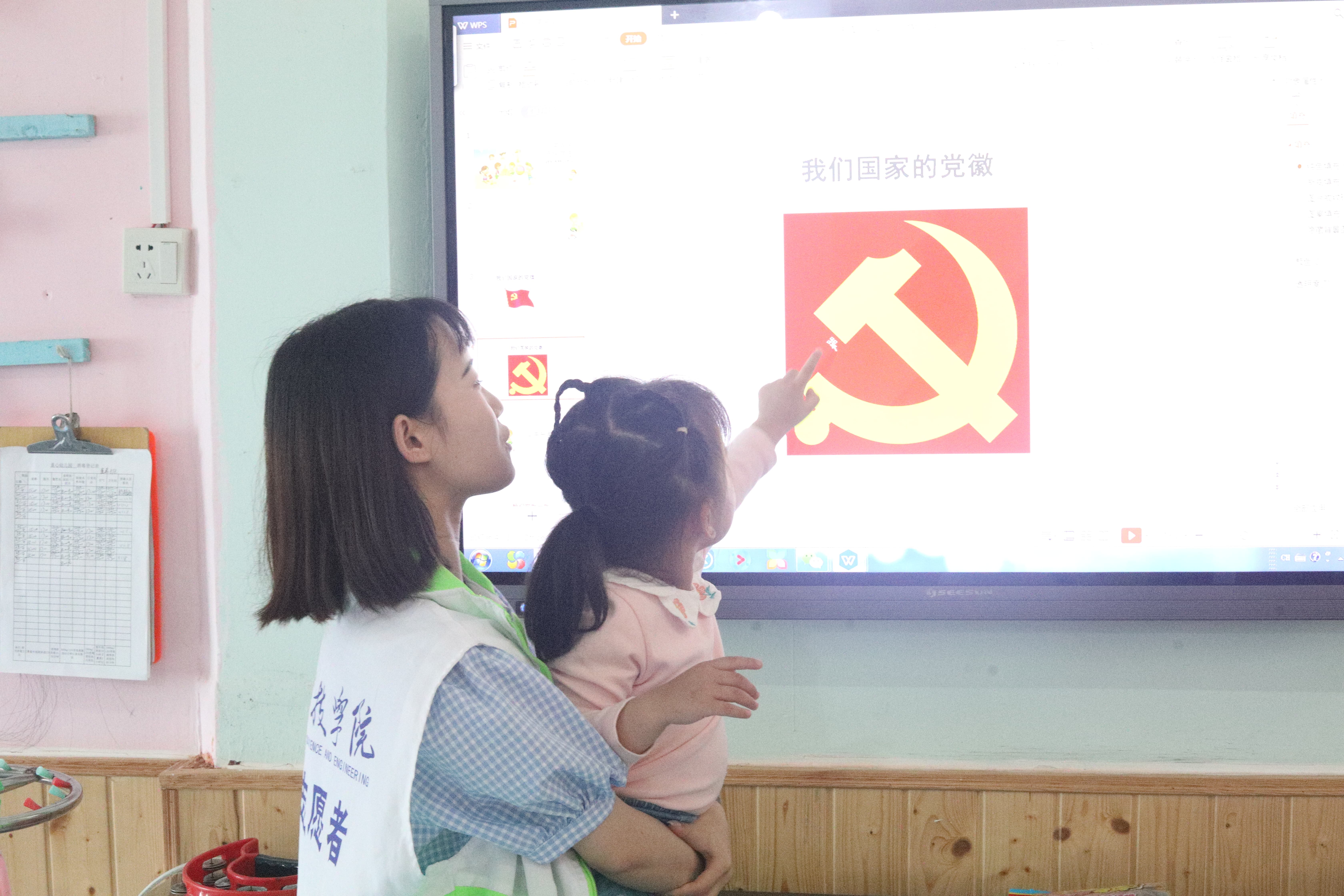 以党旗党徽为切入点,志愿者依托图片、视频等形式用通俗易懂的语言向小朋友们普及党旗党徽的由来和含义。