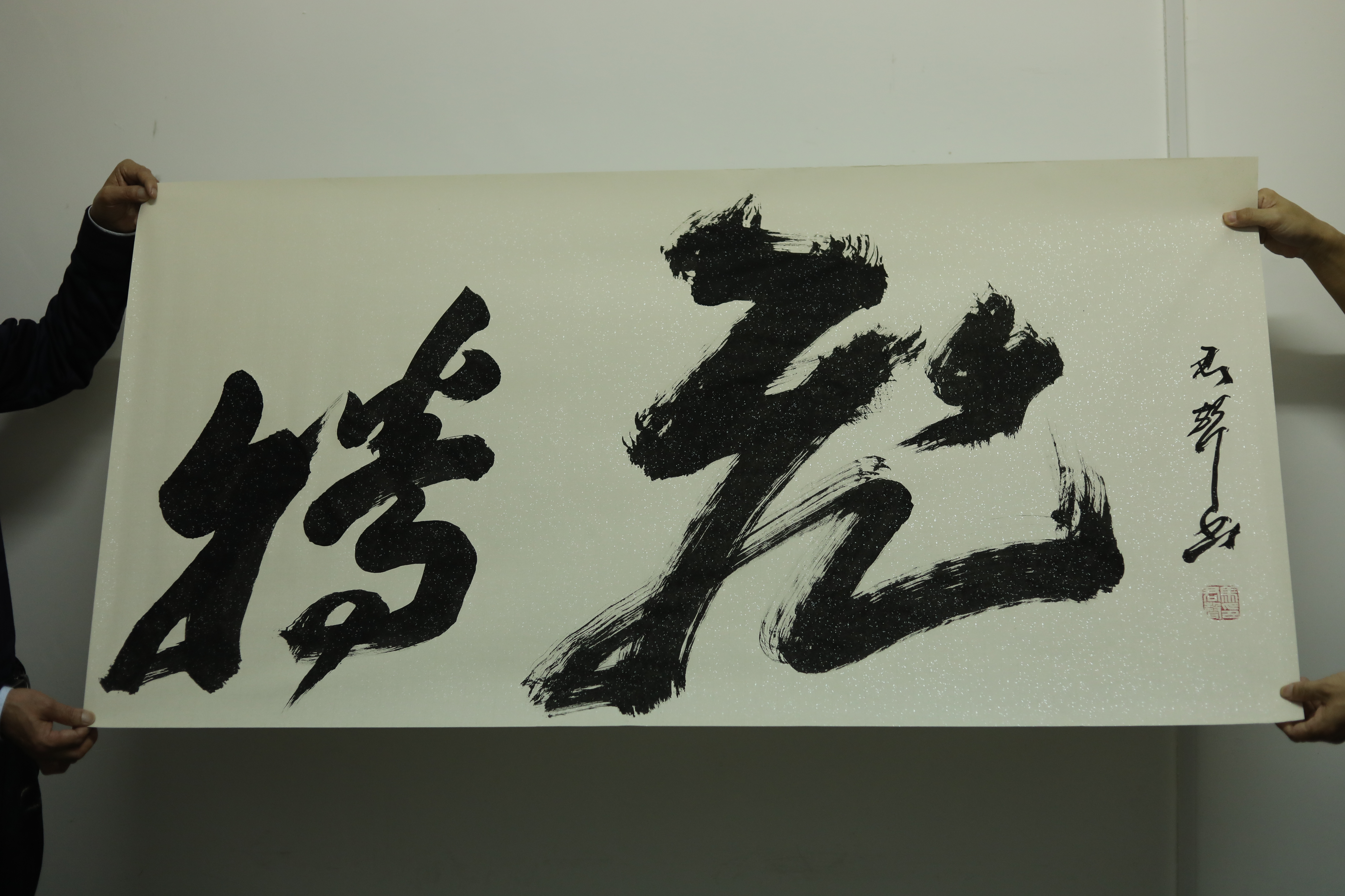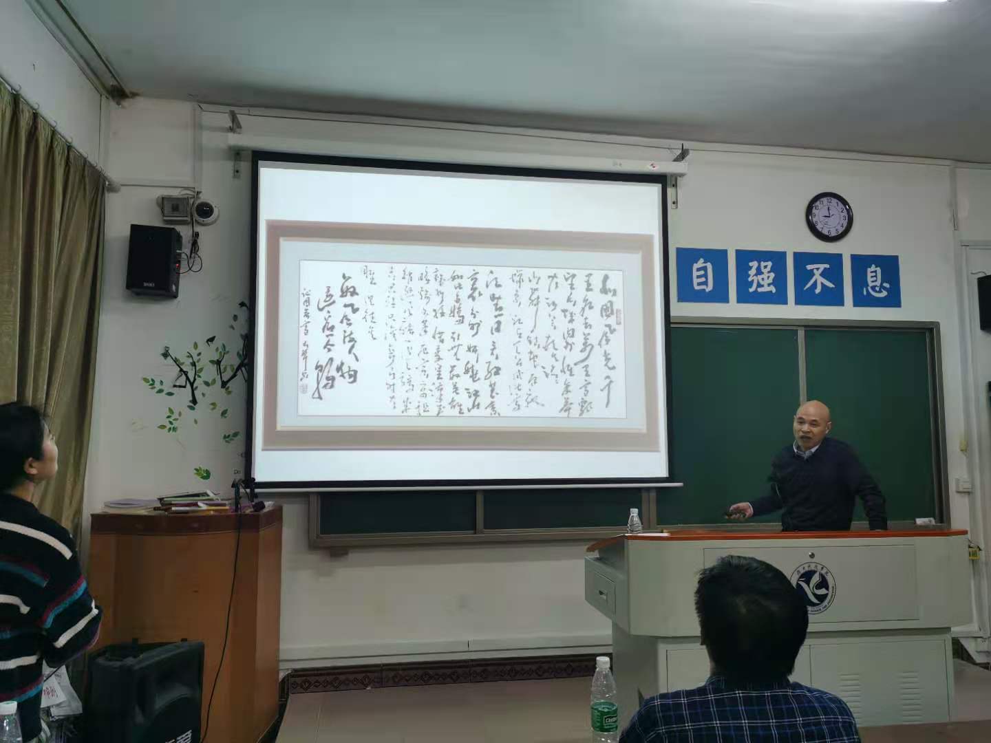授课过程中,马老师幽默风趣的授课方式赢得了在场学生的喜爱。接着,马老师给同学们展示了自己的作品,其中,书法作品《海纳百川》曾被作为国礼赠送。而令同学们印象最深刻的是书法作品《腾飞》,作品创作恢宏大气,落笔有力,且构图新颖,设计独到,彰显了书法这一传统文化的自信与强大。