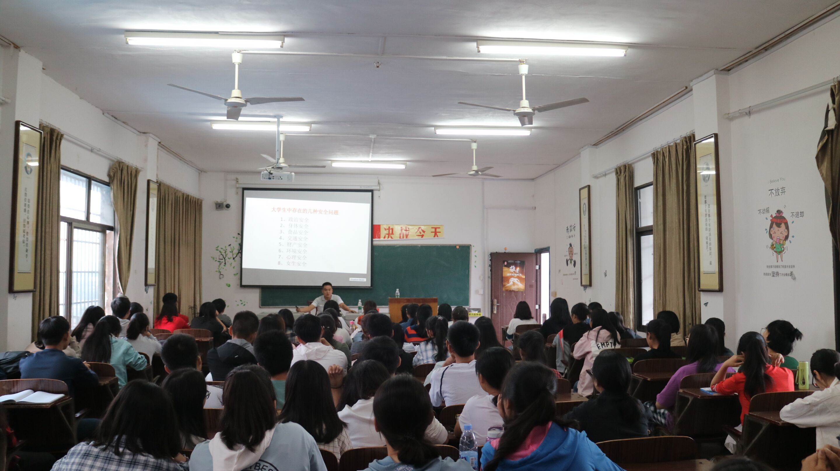 讲座中,高丹书记详细讲述了日常生活中关于“网络、网贷、传销、食品”等八个方面存在的安全隐患,并用高校真实案例指出大学生防盗防骗意识淡薄,人生安全遭受威胁的现状。同时,他还语重心长地告诫在场学生珍惜生命,要增强安全防范意识,时刻注意安全问题。最后,高丹书记发表了自己对学习成长、亲情和爱情的感想,以此勉励学生珍惜亲情,刻苦学习,走好大学成长的每一步。