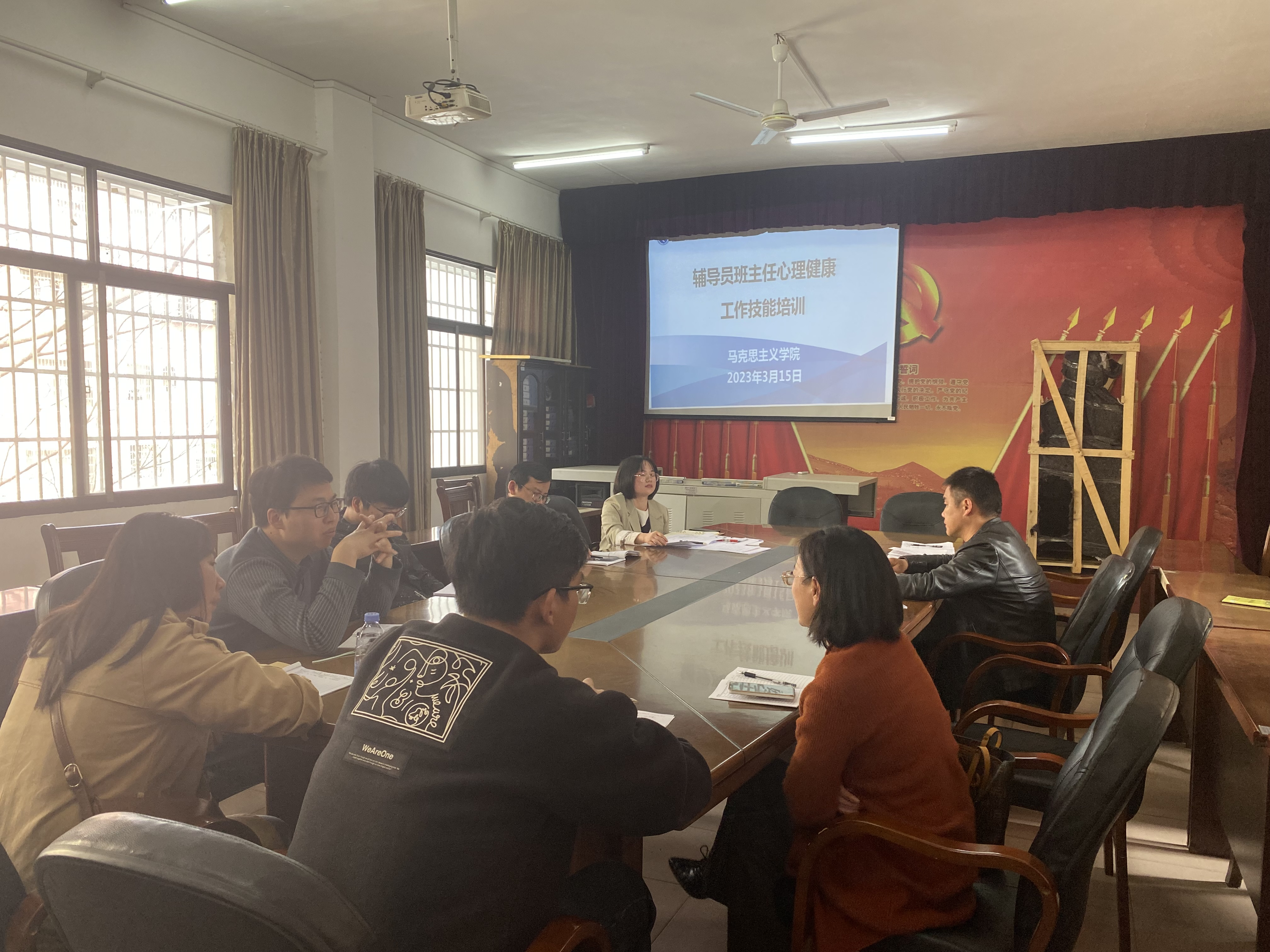 本网讯(通讯员 胡非)3月15日上午,马克思主义学院在鹤鸣楼405会议室召开学工队伍心理健康工作技能培训会议,我院党总支副书记高丹、辅导员老师曹惠如、胡非、各年级班主任参加了此次会议。会议由曹惠如老师主持。