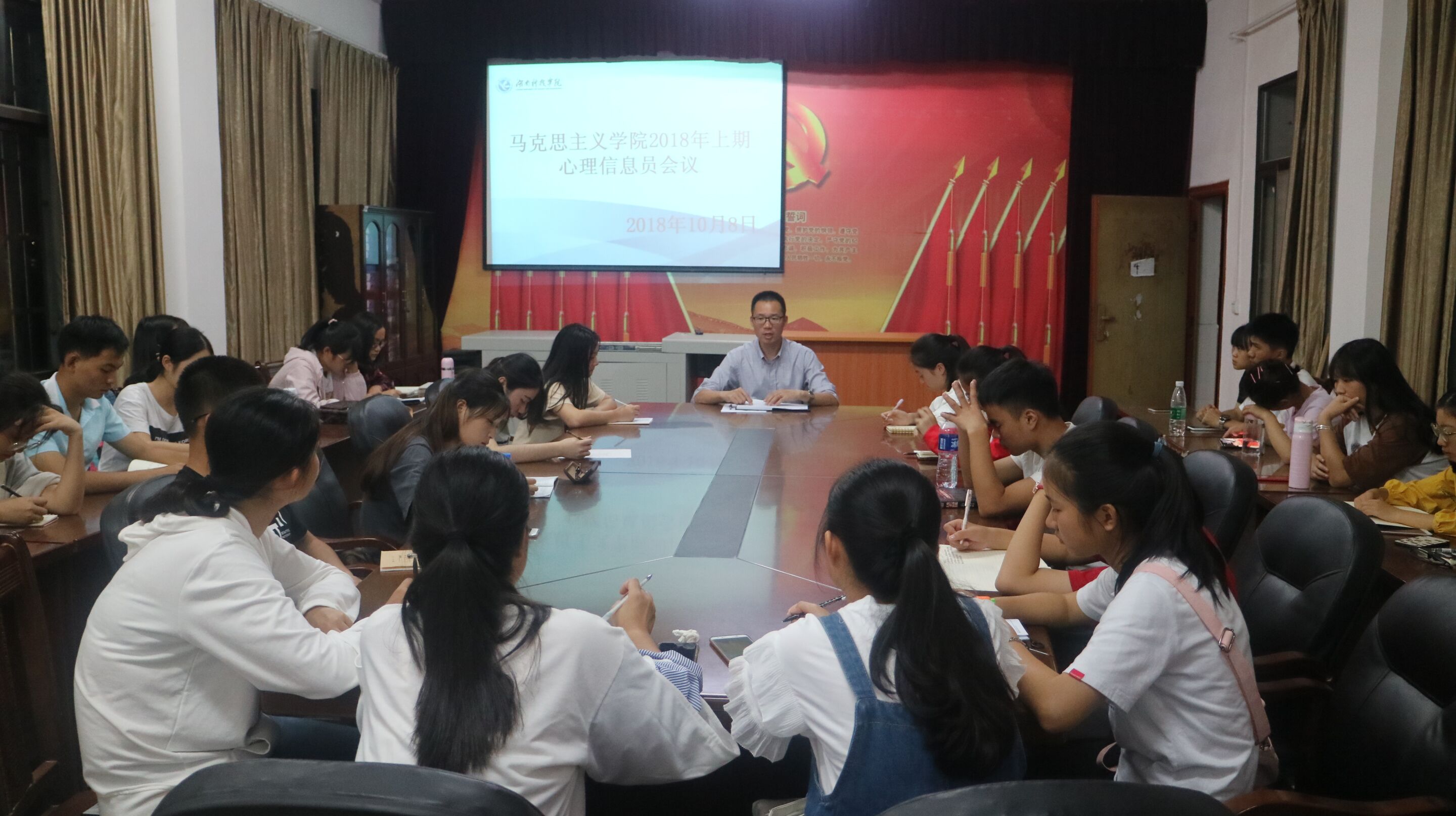 本网讯(通讯员黎雪平尹玉婷)为切实强化学生的心理素质教育,传递积极、健康生活理念,推动其全面发展。马克思主义学院于10月8日晚在鹤鸣楼405教室举行2018年上期心理信息员会议。该院心理部成员、各寝室长及宿管委员参加会议。