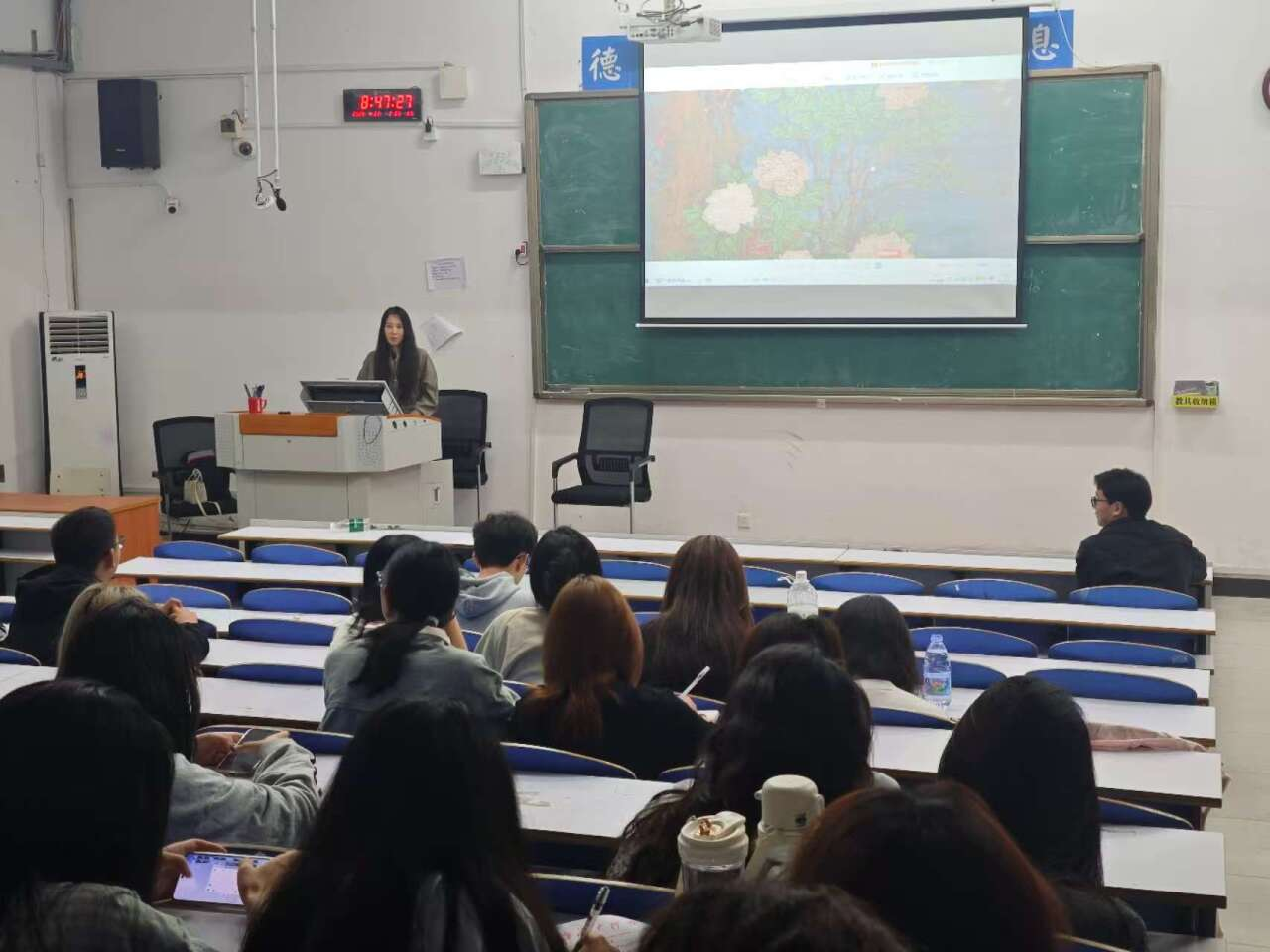 仇春霞、陈福彬两位博士以《宋代牡丹绘画的美学鉴赏》为题,分别探讨了各自对宋代牡丹绘画的不同美学鉴赏,这种新颖的讲座方式让在场师生耳目一新。本次讲座内容丰富,观点新颖,视野开阔,赢得大家的热烈掌声,纷纷感叹受益匪浅。