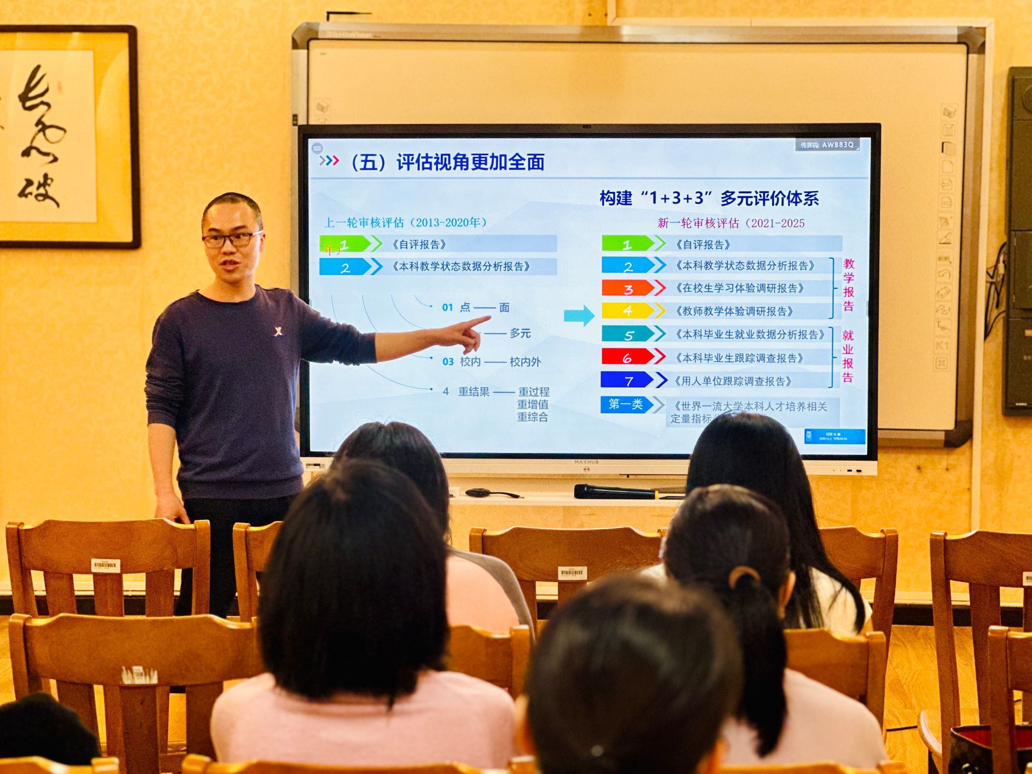 副院长柏小剑做以评估强内涵 以评估促发展 扎实做好学院评建工作辅导报告,他按照时间脉络介绍了高校评估的历史演进,着重阐述了新一轮审核评估的精髓要义,详细解读了学校评估方案,明确提出了教师、专业负责人、院领导的任务,通过分享华东师范大学和广西师范大学两所学校的审核评估经验,柏小剑强调了线上与入校评估的流程与关键点。报告会内容详实,解读深入,与会老师们进一步统一了思想,明确了任务。