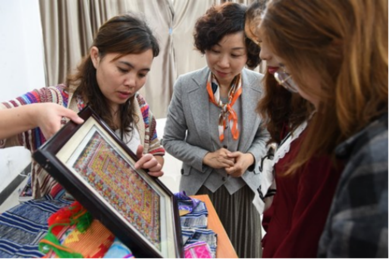 图为瑶族织锦传承人黄翠兰与美术与艺术设计学院谢筱冬教授为学生们讲解