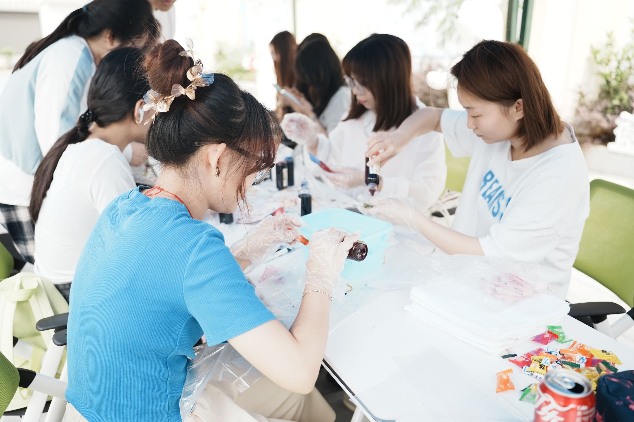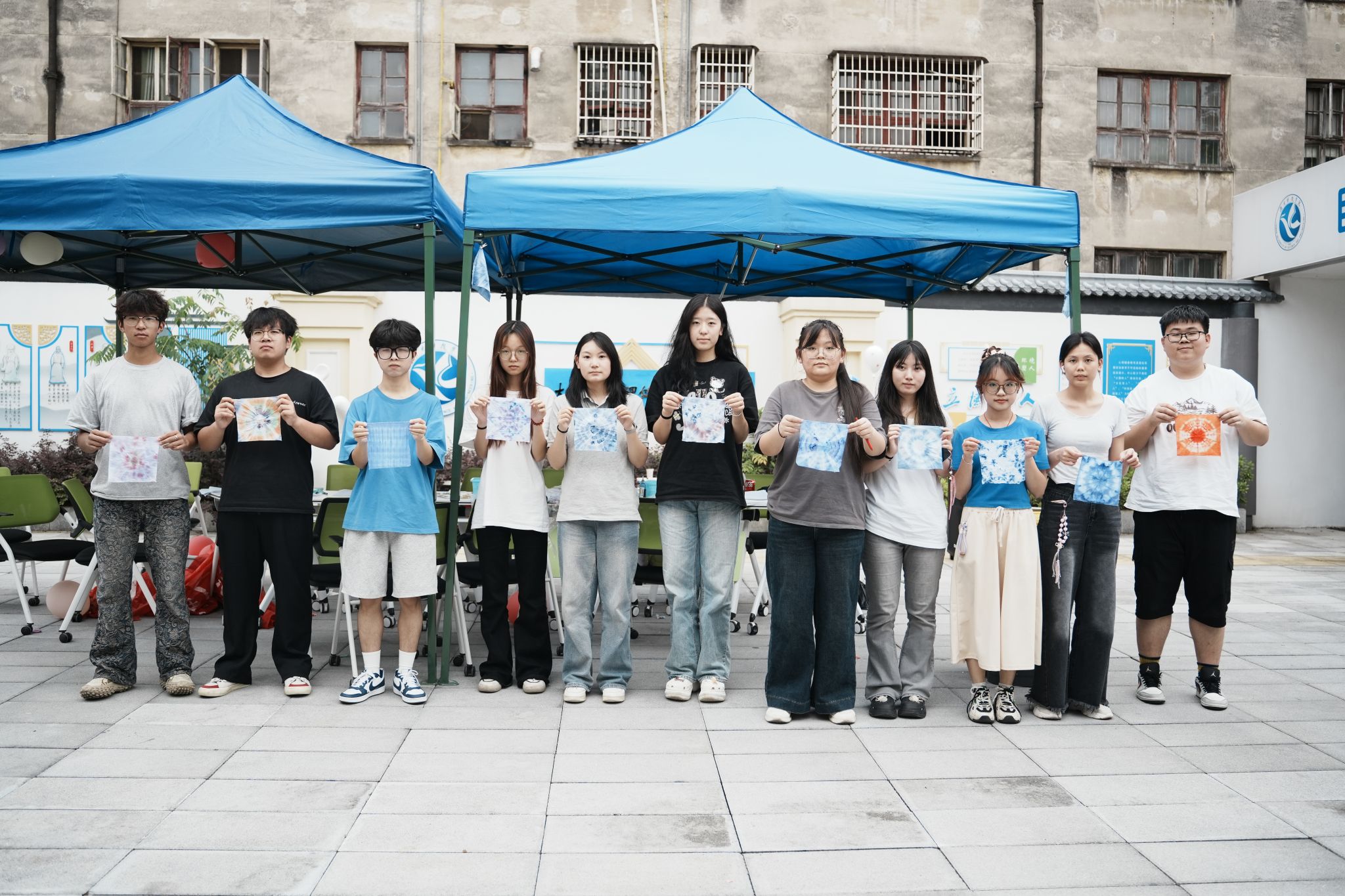 在“非遗扎染·艺术创想” 活动里,3—5人小组利用扎染工具共同创作成品,在实践中感受非遗魅力。同学们将每张布料都赋予不同色彩,看着自己亲手捆扎的布料逐渐蜕变成独一无二的艺术品,欢声笑语不绝于耳;“艺路同行” 创意绑腿跑环节趣味十足,充分考验了团队协作能力;“艺气风发” 创意踩气球大战紧张刺激,现场气氛热烈。