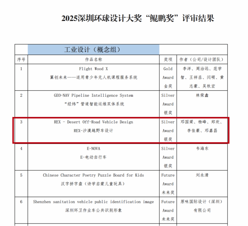 作为国际知名设计赛事,本届深圳环球设计大奖“鲲鹏奖”共收到来自全球18个国家和地区的5228件参赛作品,赛事总奖金高达400万元人民币。经过激烈角逐,由张明星老师指导,邓国梁、杨峰、李佳豪等同学共同完成的设计作品《REX-沙漠越野车设计》从众多参赛作品中脱颖而出,最终荣获银奖并获得3万元奖金,展现出我院师生卓越的专业能力和创新水平。