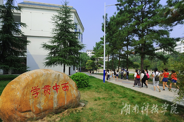 “学贯中西”文化石立于博雅楼前。“学贯中西”出自清·吴趼人《二十年目睹之怪现状》第八十一回:“本领事久闻这位某观察,是曾经某制军保举过他留心时务、学贯中西。”意指学问贯通了中国和西方的种种知识,形容知识渊博。立石于此,意在激发学子必须学习和利用国外先进经验,吸收国外的一切好东西,把学习外国与自我独创相结合,成长为一名综合素质全面的应用型人才。