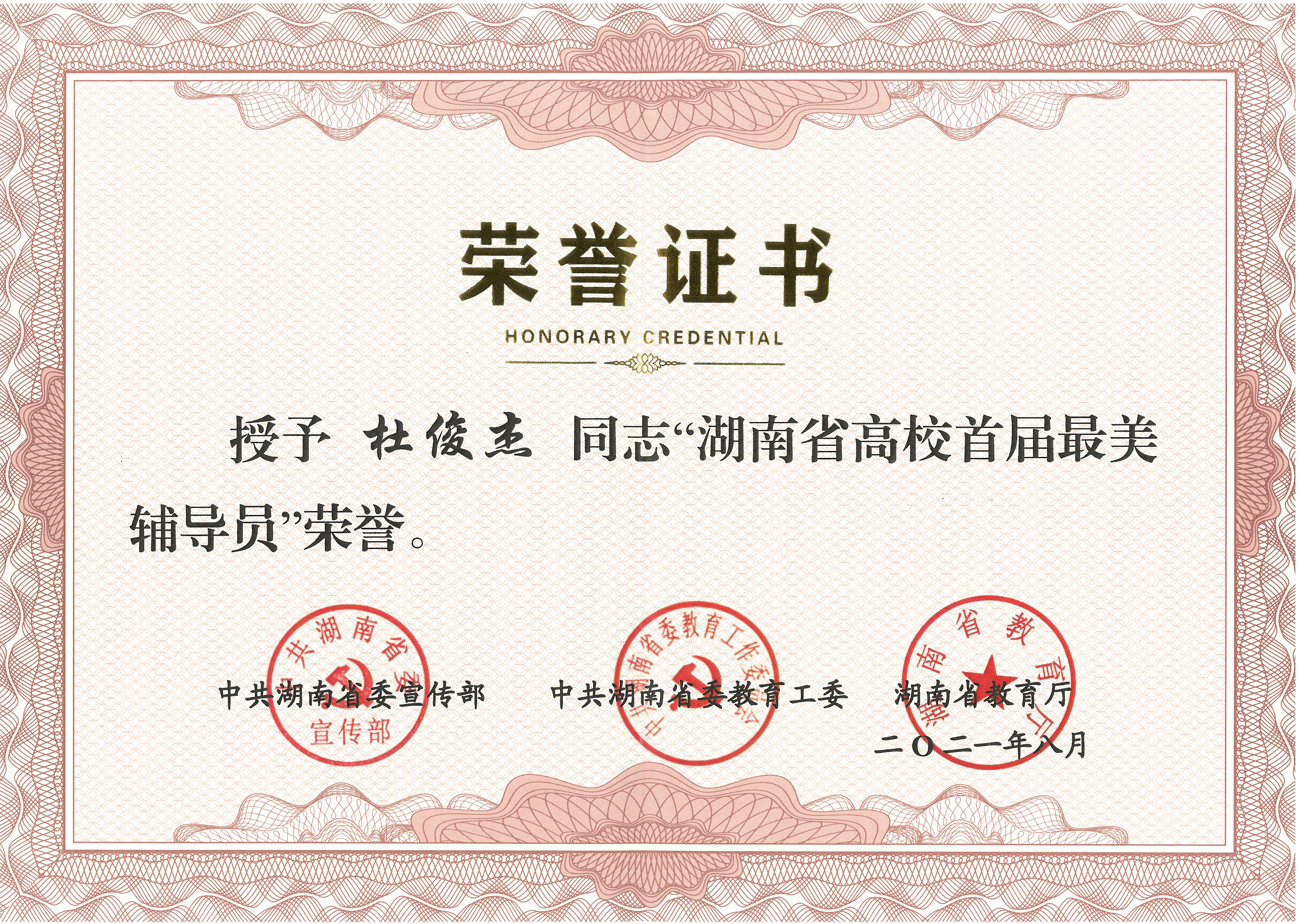 杜俊杰在担任理学院辅导员期间潜心求索,诠释对事业的无上追求;满腔热情,播撒对学生的无尽关爱,是学生眼中的万能“小度”。在新冠肺炎疫情防控阻击战期间,他化身“爱心传递员”,将考研复试资料寄送到备考学子手中,坚定学生考研和战胜疫情的信心。在2020届240名毕业生即将离校之际,他精心为每一个毕业生送上一封亲笔信,表达不舍的深情和美好的祝福。他的事迹被《人民日报》、新华网、《中国教育报》等主流媒体报道20余次。获得湖南省高校辅导员年度人物、永州市青年岗位能手等荣誉。