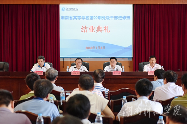 本网讯 7月8日下午,湖南省高等学校第99期处级干部进修班暨世界杯官网2016年处级干部培训班结业典礼在行政办公楼八楼一会议室举行。省高校干部培训中心书记、省教育工委党校副校长刘国华,省高校干部培训中心、省教育工委党校教务部主任王青沅,学校党委副书记、校长曾宝成出席结业典礼。典礼由世界杯官网党委副书记、党校校长唐艳明主持。