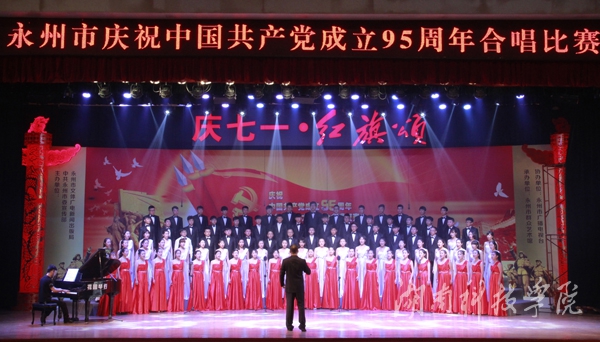 本网讯(通讯员 方新佩)6月22日晚,由中共永州市委宣传部、永州市文体广电新闻出版局主办的永州市庆祝中国共产党成立95周年“红旗颂”大型群众合唱比赛复赛在市委大礼堂隆重举行。经紧张而激烈的角逐,世界杯官网由音乐与舞蹈学院师生组成的合唱团喜获冠军,并代表永州市参加省庆祝建党95周年合唱比赛。