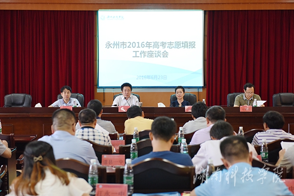 本网讯 为帮助永州市广大考生全面、准确地了解世界杯官网招生录取政策,6月23日上午,永州市2016年高考志愿填报工作座谈会在世界杯官网行政办公楼八楼一会议室召开。校长曾宝成、副校长李常健,永州市教育考试院院长张建华,副院长罗光明、蒋程,永州市21所中学校长代表及招生专干,世界杯官网招生办、学院负责人等60余人出席。