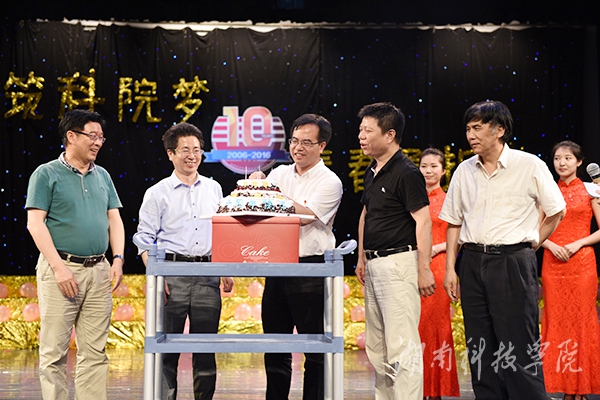 晚会现场,校领导一齐上台祝福社团联合会10周岁生日快乐。