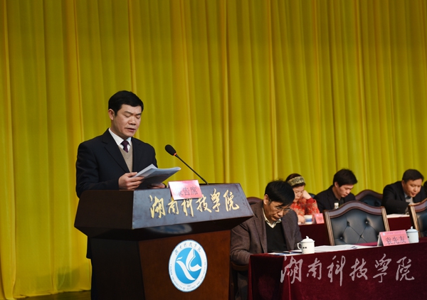 党委副书记、校长曾宝成作题为《聚焦目标任务,狠抓工作落实,为建设高水平应用型大学打下坚实基础》的工作报告。曾宝成在报告中总结回顾了去年学校工作。他指出,2015年,学校在省委省政府的正确领导下,全校上下认真贯彻落实党的十八大和十八届三中、四中、五中全会精神,深入学习贯彻习近平总书记系列重要讲话精神,遵循“六精”战略布局,励精图治,攻坚克难,圆满完成了学校《章程》核准与颁布、第三次党代会召开、干部竞聘上岗、绩效工资改革等在学校发展史上具有重要意义的一系列大事,在思想政治工作、人才培养、学科建设、科学研究、社会服务、内部管理等方面取得了可喜成绩,呈现出良好发展势头和广阔发展前景。
