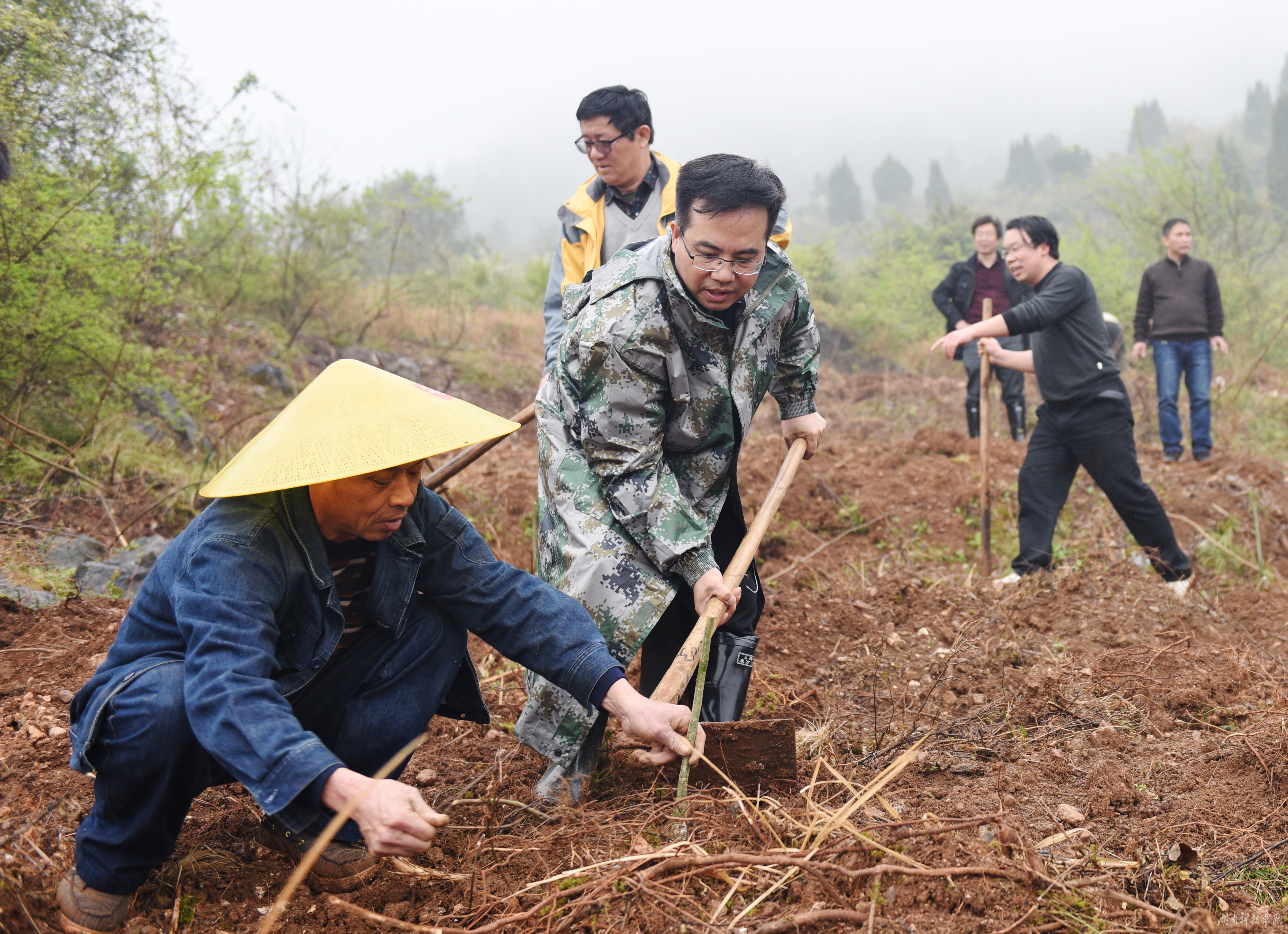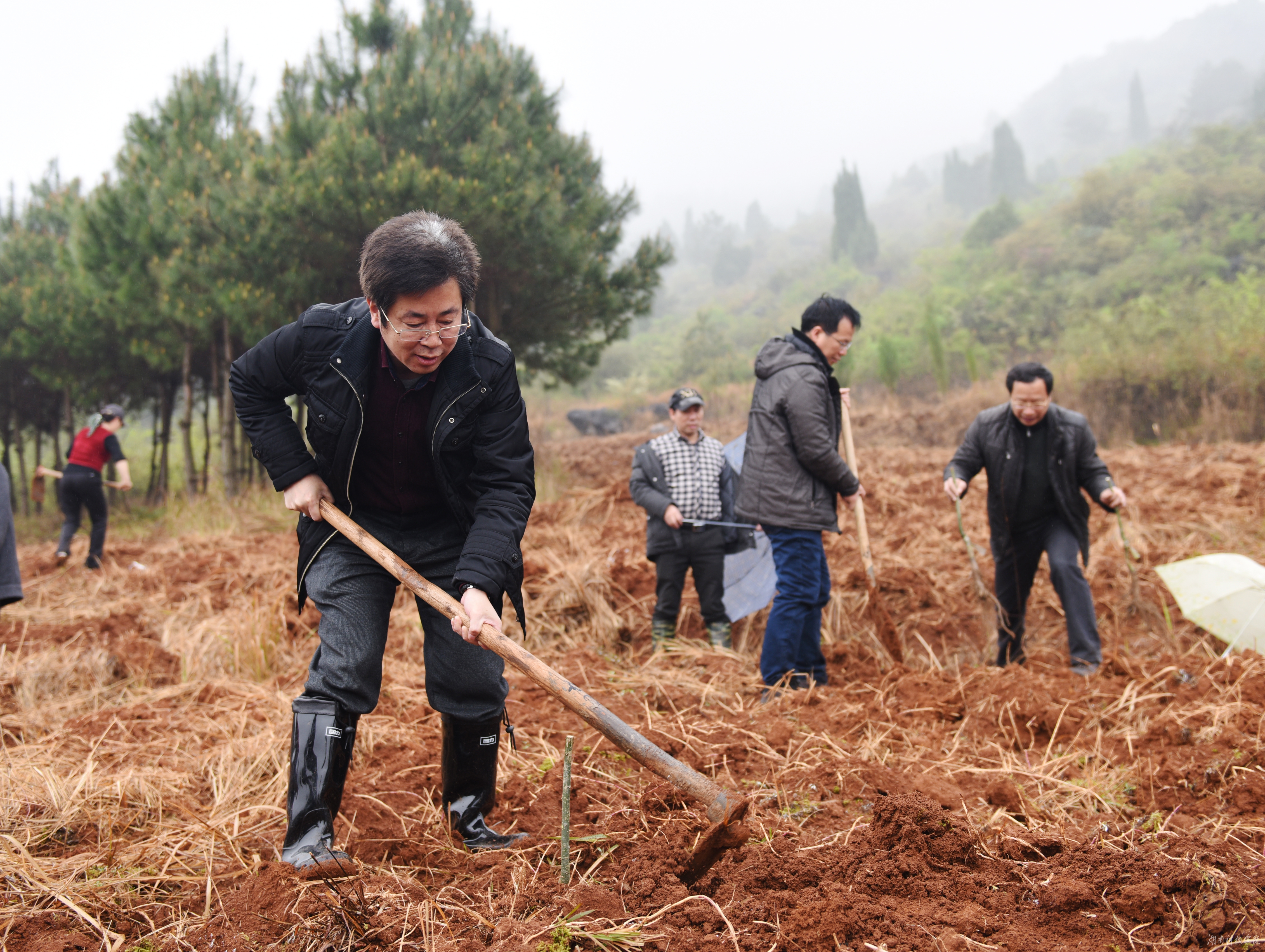 本网讯 (记者 马天天 摄影 何帅文) 助栽致富林,兴业促脱贫。3月16日,新田县龙泉镇潮水铺村精准扶贫工作正在紧锣密鼓的进行,开山种树,发展金槐产业,掀起扶贫开发的又一轮新高潮。学校党委书记陈弘、校长曾宝成及其他在校校领导唐艳明、郑山明、李常健、吴小林、袁先友、陈仲庚和40余名中层干部赴潮水铺村为缺乏劳动力的贫困户种植金槐500余株,为当地金槐产业再添一片新绿。