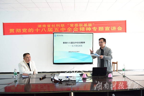 在潮水铺村座谈时,陈弘以图文并茂的方式,生动活泼的向乡亲们解说了十八届五中全会公报中共享发展的新理念,让村民能真切了解共享理念下的“十三五”规划给百姓带来的实惠。他从“加快提高户籍的城镇化率”、“实施精准扶贫,精准脱贫”、“普及高中阶段教育,逐步推进实施中职免费教育”、“提高技术工人待遇”、“坚持居民收入增长和经济同步”、“减少政府对价格形成的干预”、“实施全民参保计划”、“推进健康中国建设”、“全面放开二孩”、“绿色发展,生态文明建设”等方面进行了深入阐释,指出国家将针对农民脱贫致富出台的相关政策,让全体人民能在共建共享中有更多的获得感。