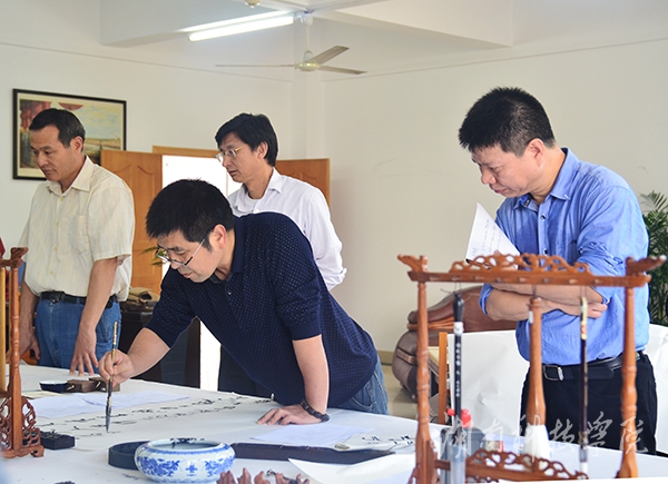 省书法家协会理事兼永州市书法家协会主席唐朝晖、中国美术家协会会员兼永州市美术家协会主席、原美术与艺术设计学院院长杨球旺、省书法家协会理事欧阳维忠、市书法家协会副主席陈刚、张玉波、宋运清、唐幼铎及书法家唐彦、周昌俊,我院美术与艺术设计学院周飞战、高双洋,以及爱好书法与绘画的文人墨客30多位前来参加此次活动,此次所创作的72幅佳作将由世界杯官网图书馆进行装裱、珍藏,以进一步营造图书馆浓郁的文化氛围。