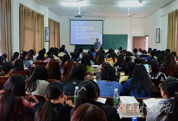 张丰清与同学们分享了自己的求学经历和亲身体验,他用生动风趣的语言,贴近生活的实例为大家详尽解说,阐述考研的“复杂”与成本,将考研与考公务员、较为低端的就业前景、较为昂贵的出国成本相比较,分析考研的优势与益处;他对考研现状进行剖析,针对目前研究生报考院校、专业人数、地区分布不均匀现象表明自己的看法,并为学生提出应对方法。他认为,考研是人生的第二次高考,是一条值得努力和坚持的正确道路,并鼓励学生自强自信,明确考研规划与定位,为考研做充分准备。整个讲学轻松活泼、气氛愉悦,期间掌声、欢笑声不绝于耳。