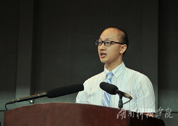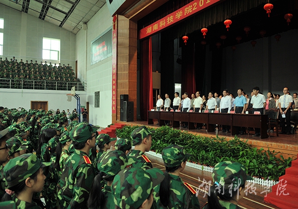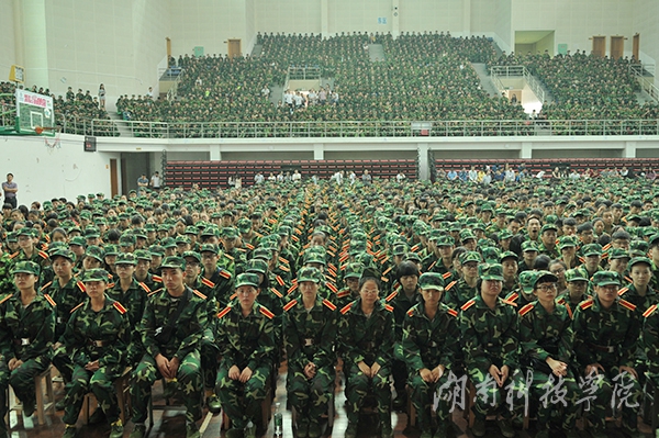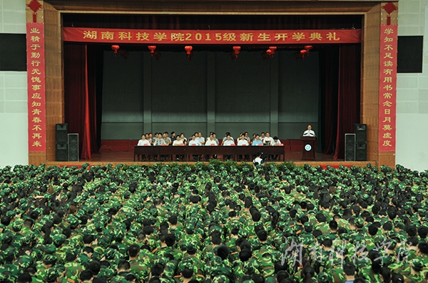 “初秋九月,西山脚下,秋风夹着凉爽,农民丰收金黄的稻穗;风华正茂,灵犀桥上,青涩带着成熟,你们享受六月的战果;海纳江河,潇水之滨,感叹携着惊喜,学校喜迎亲爱的你们。”校长曾宝成面对近4000名新生,满怀深情地发表题为《把握青春,做自强科院人》的讲话。