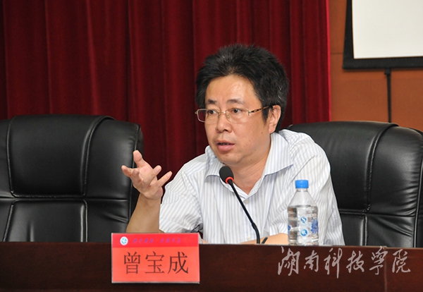 曾宝成认为,学校的发展要牢牢把握三个关键词:转型、内涵、突围,转变思想观念,突出“地方性”办学定位,培养应用型人才,实现“突围”,发展符合社会发展和地方经济建设的特色学科专业。他结合学校的今后规划,认为,学校转型发展的内涵在于提高和建立应用型学科专业体系,主要做好九个方面的工作:一是创建应用型学科专业体系;二是培养产教融合、协同育人的人才模式;三是建立体现产业行业发展要求和科技进步的课程体系;四是推进以体现素质教育、创新精神和实践能力的教学模式改革;五是统筹规划教学资源建设;六是深化创新创业教育改革,提升学生创业就业能力;七是加强“双师双能型”教师队伍建设;八是提高学校应用研究和技术创新能力;九是加强应用型人才培养的国际交流与合作。
