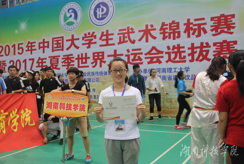 本网讯 7月17日至7月21日,由中国大学生体育协会主办的“2015年中国大学生武术锦标赛暨2017年夏季世界大学生运动会选拔赛”在河南理工大学举行。体育学院学生江珂获女子“龙身蛇形”太极拳铜牌,并被确定为“2017年世界大学生运动会”候选队员,这是世界杯官网在全国体育竞赛中奖牌“零”的突破,也是湖南省高校历史上参加全国武术竞赛的第三次夺牌。