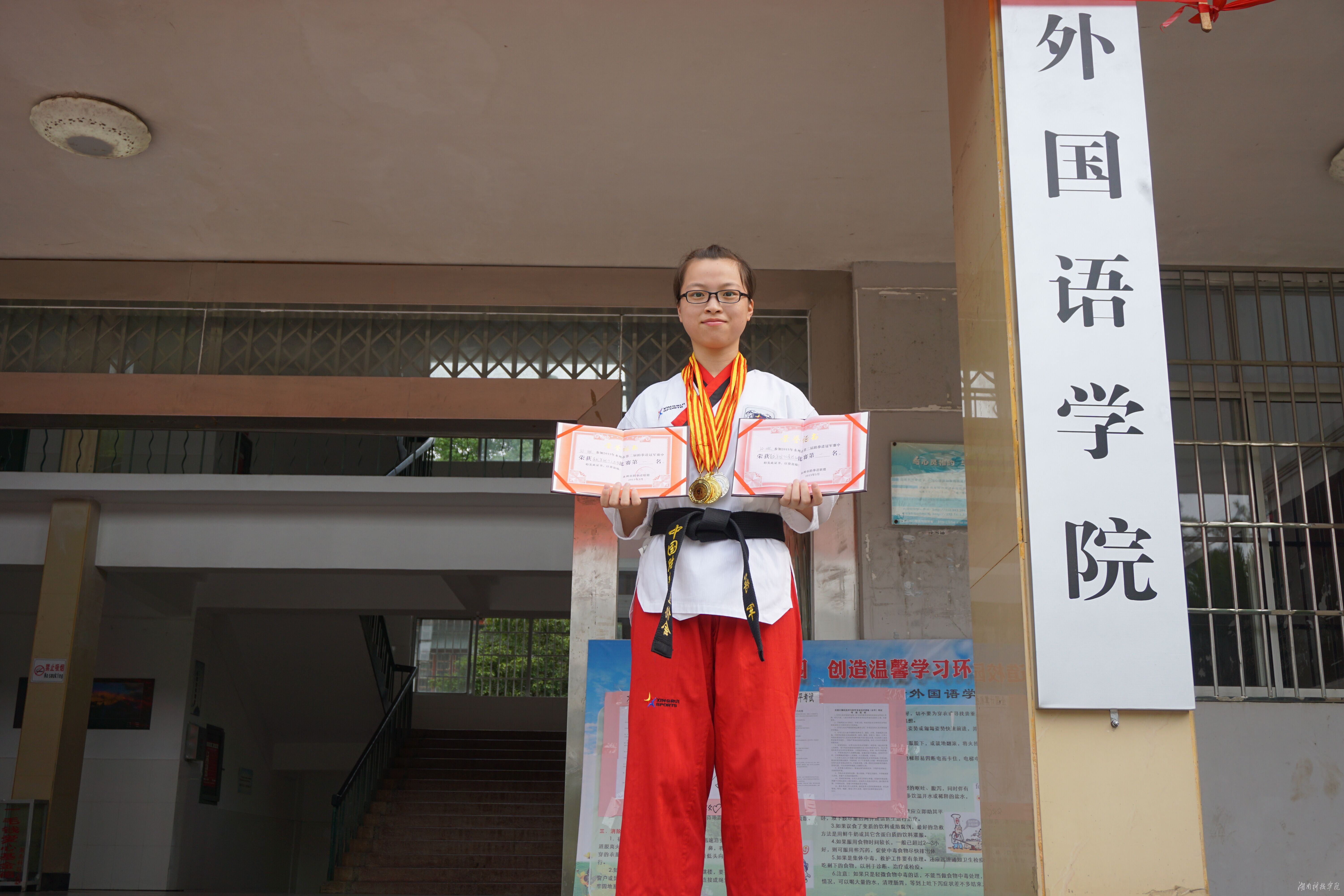 本网讯(通讯员 陈小峰)6月2日,从永州市跆拳道冠军赛传来喜讯,世界杯官网外国语学院2014级学生孙琳荣获青成年组混双品势、个人品势、个人竞技三项冠军,青成年组团体品势银牌。