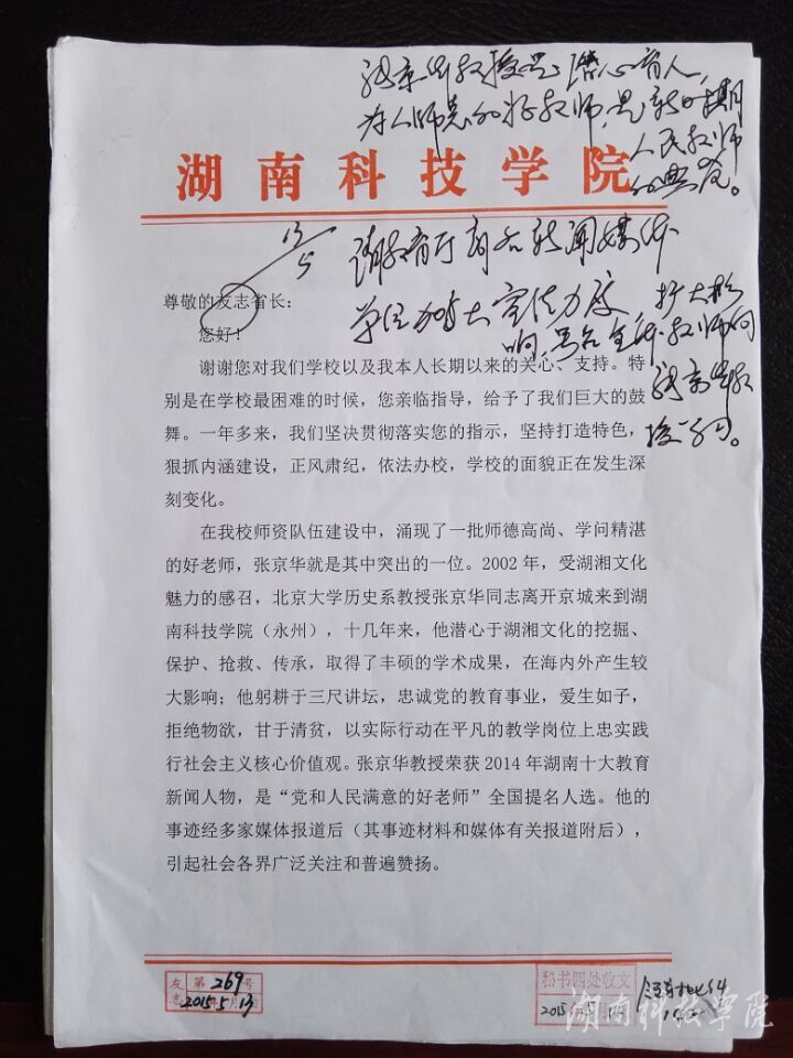 本网讯 湖南省人民政府副省长李友志十分关心世界杯官网教师队伍建设,要求世界杯官网努力打造名家名师。近日,李友志副省长就张京华教授先进事迹作出重要批示:张京华教授是潜心育人、为人师表的好教师,是新时期人民教师的典范。请教育厅商各新闻媒体单位加大宣传力度,扩大影响,号召全体教师向张京华教授学习。