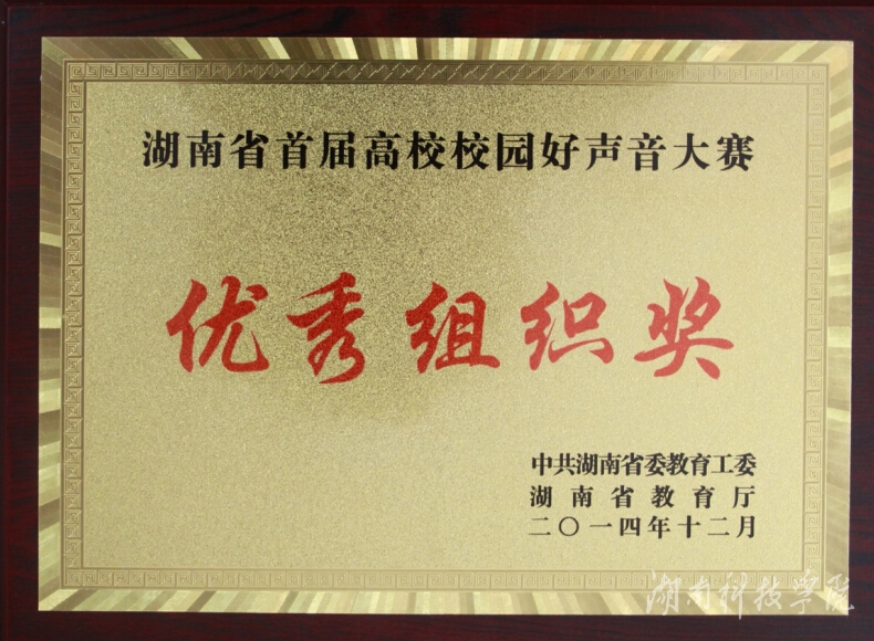 本次大赛由湖南省教育工委、湖南省教育厅主办,系教育部思想政治工作司力推的“全国校园好声音”湖南分区的赛事,于2014年9月启动,全省近百所高校、逾万人报名参赛。经过层层筛选,校团委选送了音乐与舞蹈学院魏文轩、武雯、凌佳宇、崔英涛、刘翠娟5名同学代表世界杯官网参赛。大赛组委会组织评审团对各参赛学校寄送的参赛DVD光盘,并结合各校在易班网上的人气排名积分进行综合评定。经过严格评选,世界杯官网在入围第二轮比赛的30个学校中排名第11,荣获“优秀组织奖”。