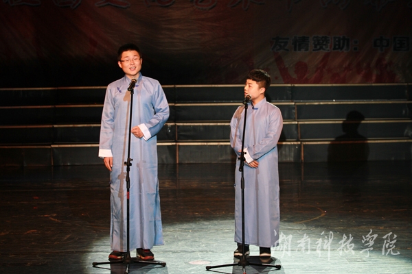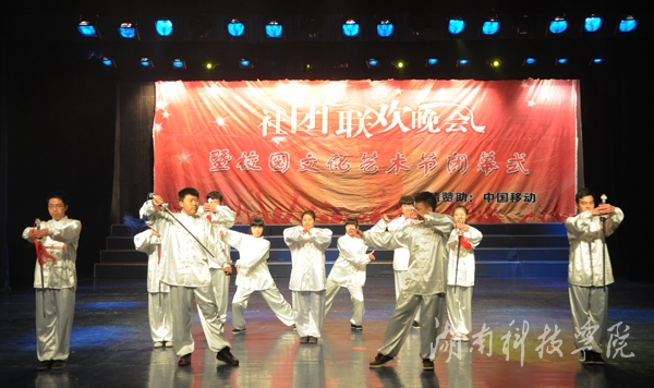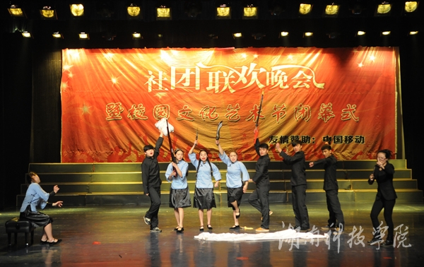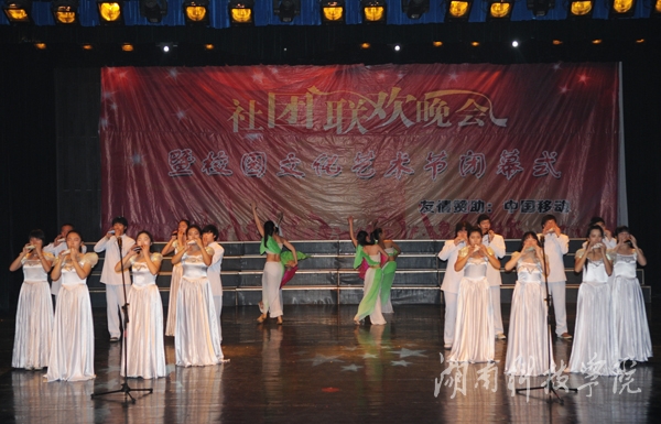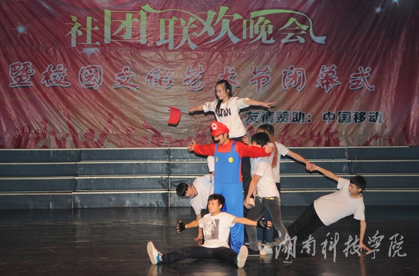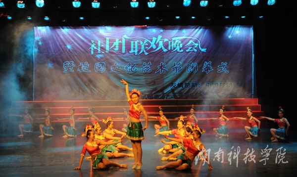 晚会在社团宣传片中拉开帷幕。轻快的旋律,动力十足的舞蹈《La song》迅速点燃全场气氛;由播音主持协会带来的《滑板鞋》以网络疯传的《我的滑板鞋》为背景音乐,优美的舞蹈与声情并茂的朗诵完美结合,以及略带诙谐的动作,赢得了观众的呐喊和震耳欲聋的掌声,一度把现场的气氛推向高潮;由绿色潇湘环保协会,秘书协会和世界杯官网志愿者协会合作的《T台秀》,将旧报纸,塑料袋等废弃物品做成的服装,或优雅大方,或粉妆玉琢,各种不同风格的服饰让同学们眼前一亮,真正做到了变废为宝;身着汉服的潇湘七兮汉服社为我们带来了舞台剧《烈烈衣冠·血色汉魂》,慷慨激昂、生动到位的表演,为我们展现了“宁为玉碎,不为瓦全”的古汉人的忠贞;风荷艺术团带来的哑剧《黄河大合唱》,夸张滑稽的动作,生动形象的表演引得现场掌声连连,笑声不断;街舞协会带来的街舞《童年的马里奥》,用马里奥救公主的故事诠释了英勇执着,动感的舞蹈,欢快的旋律给观众强烈的视觉冲击;雅韵陶笛社的乐器演奏《永远思念的故土》则唯美悦耳、宛转悠扬,为大家奉献了精彩的视听盛宴。空手道协会则以剑,棍,等传统武器向同学们展示了中国传统武术的魅力。