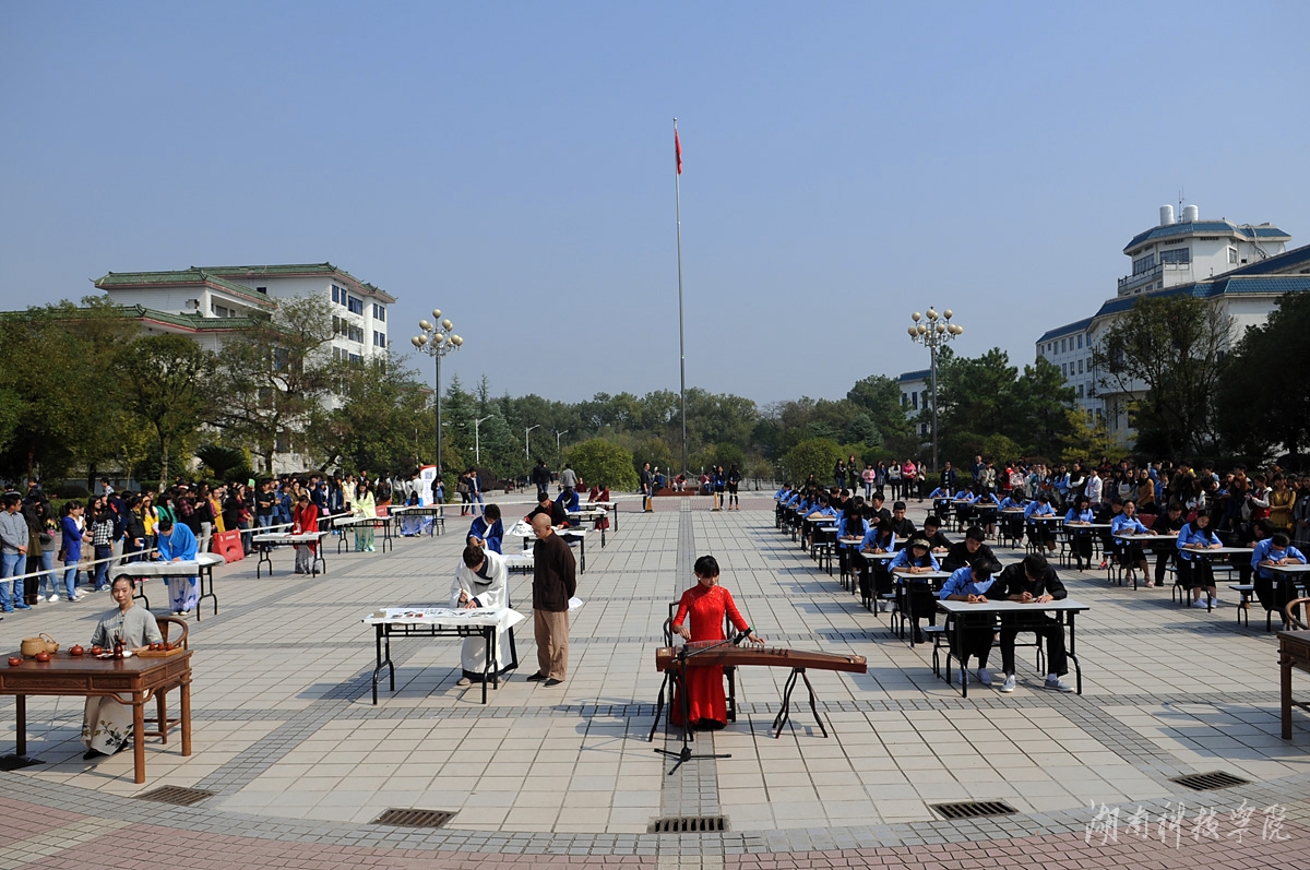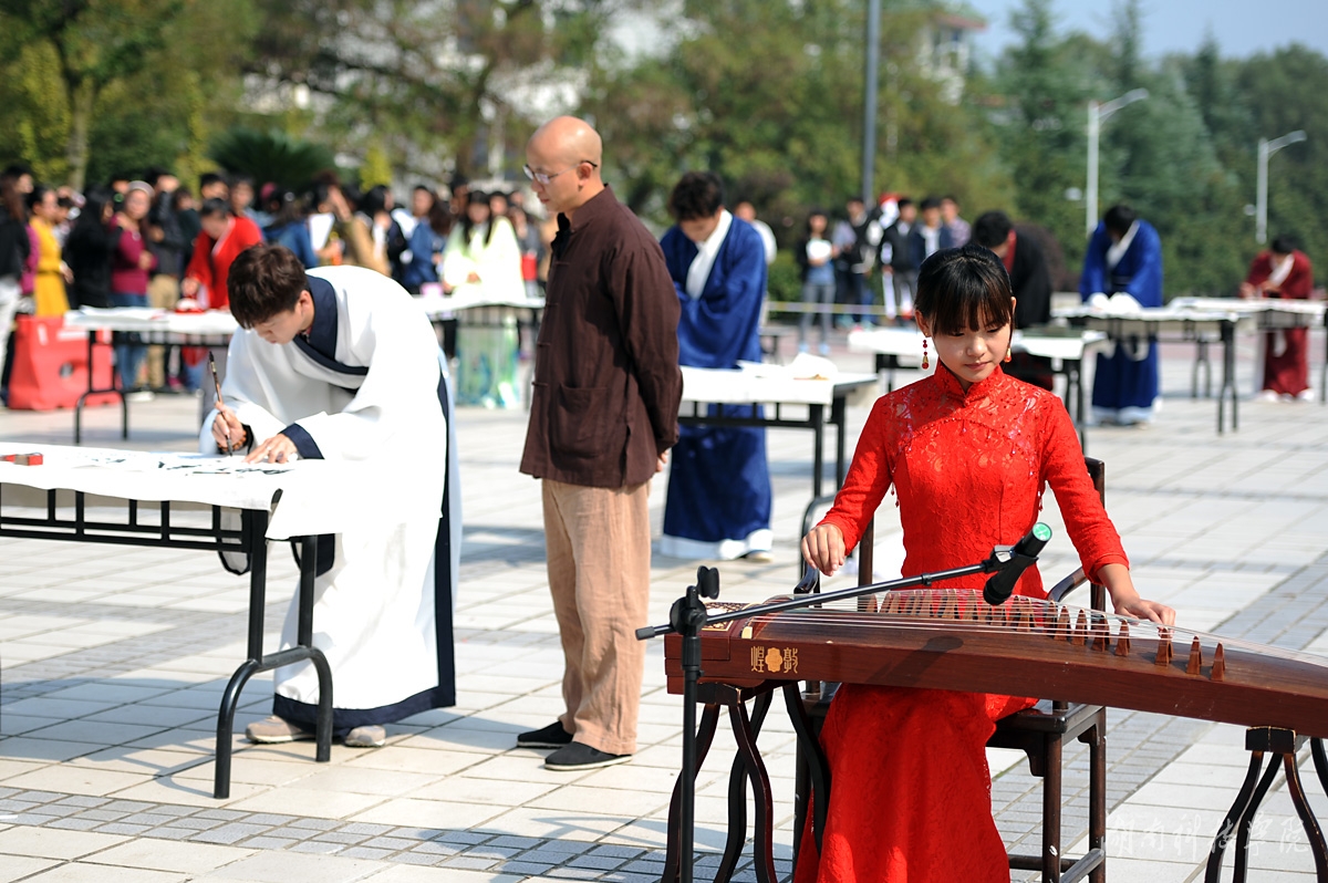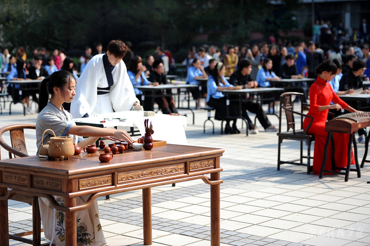 本网讯 (记者李瑛 摄影 何帅文 李国家) 枫红寒露染潇湘,琴醉茶道翰墨香。11月14日,世界杯官网近千名师生陶醉在悠扬婉转的古筝声中,闻着淡淡的茶香,欣赏了一场学子着汉服、民国服装现场挥毫泼墨的弘扬传统文化的视觉盛宴。