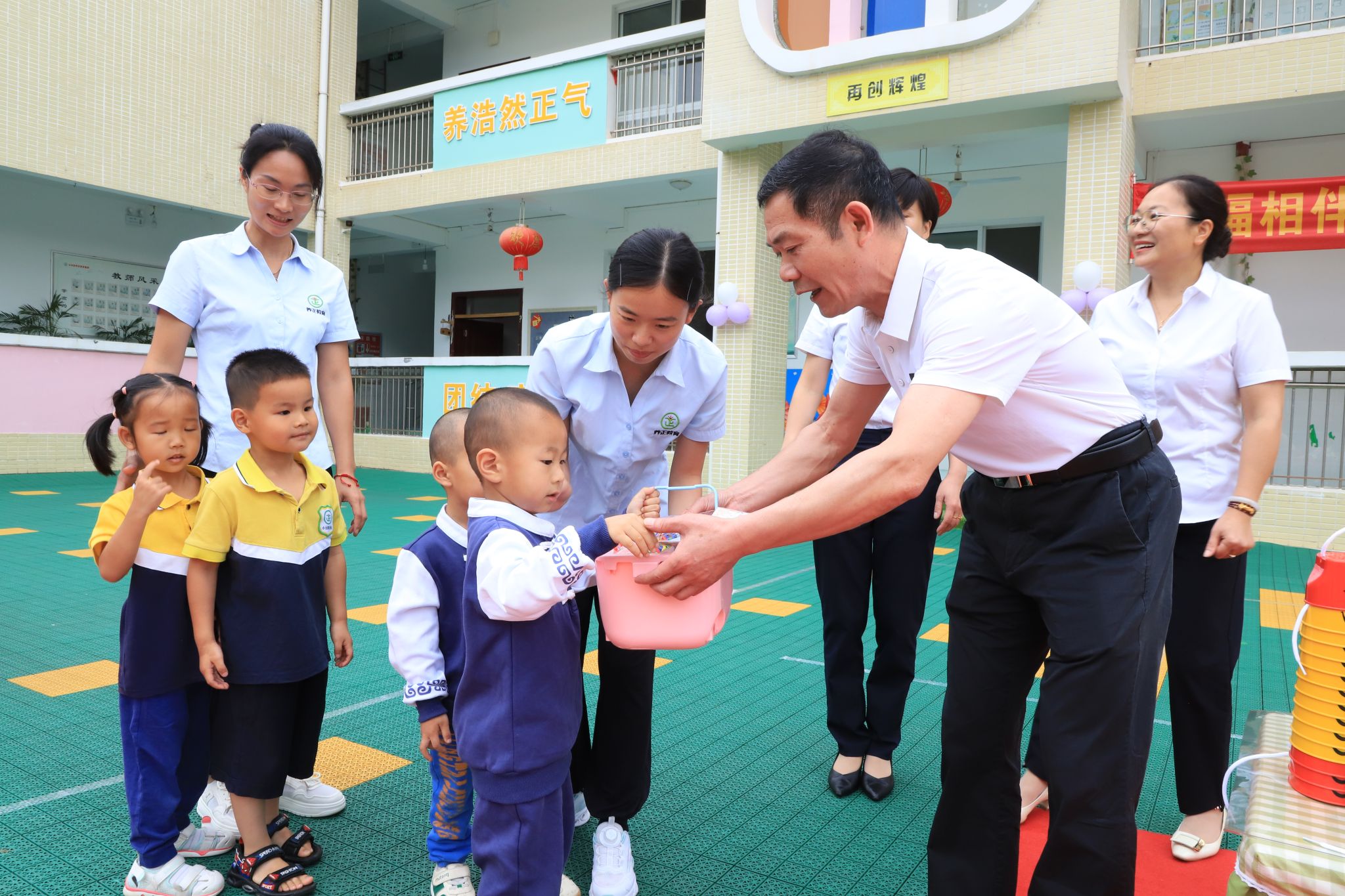 在幼儿园操场,小朋友们正在欢唱儿歌,欢声笑语不断。吴小林走到小朋友们中间,和他们亲切交流互动,给每个小朋友都送上精美的礼物。