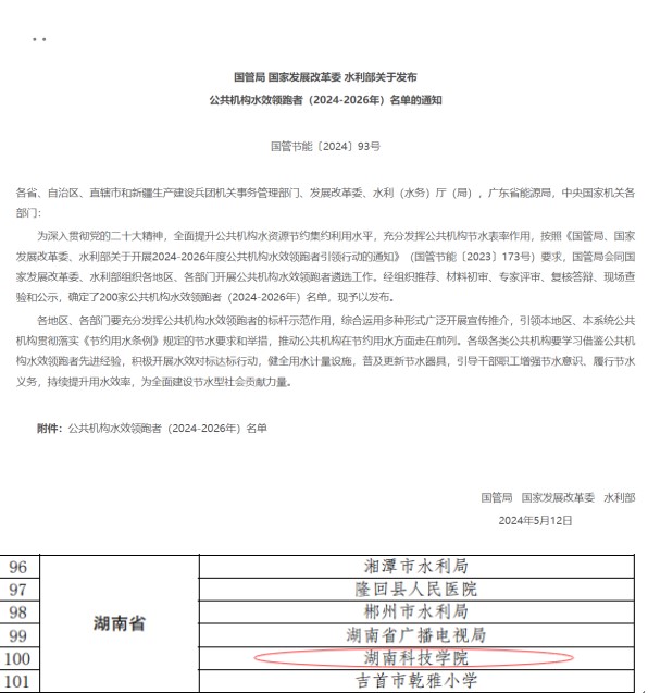 本网讯(通讯员 王艳香)近日,国家机关事务管理局、国家发展改革委、水利部联合发布了《关于发布公共机构水效领跑者(2024-2026年)名单的通知》(国管节能〔2024〕93号),公布了200家公共机构水效领跑者(2024-2026年)名单,世界杯官网名列其中,同时也是湖南省唯一获此殊荣的高校。