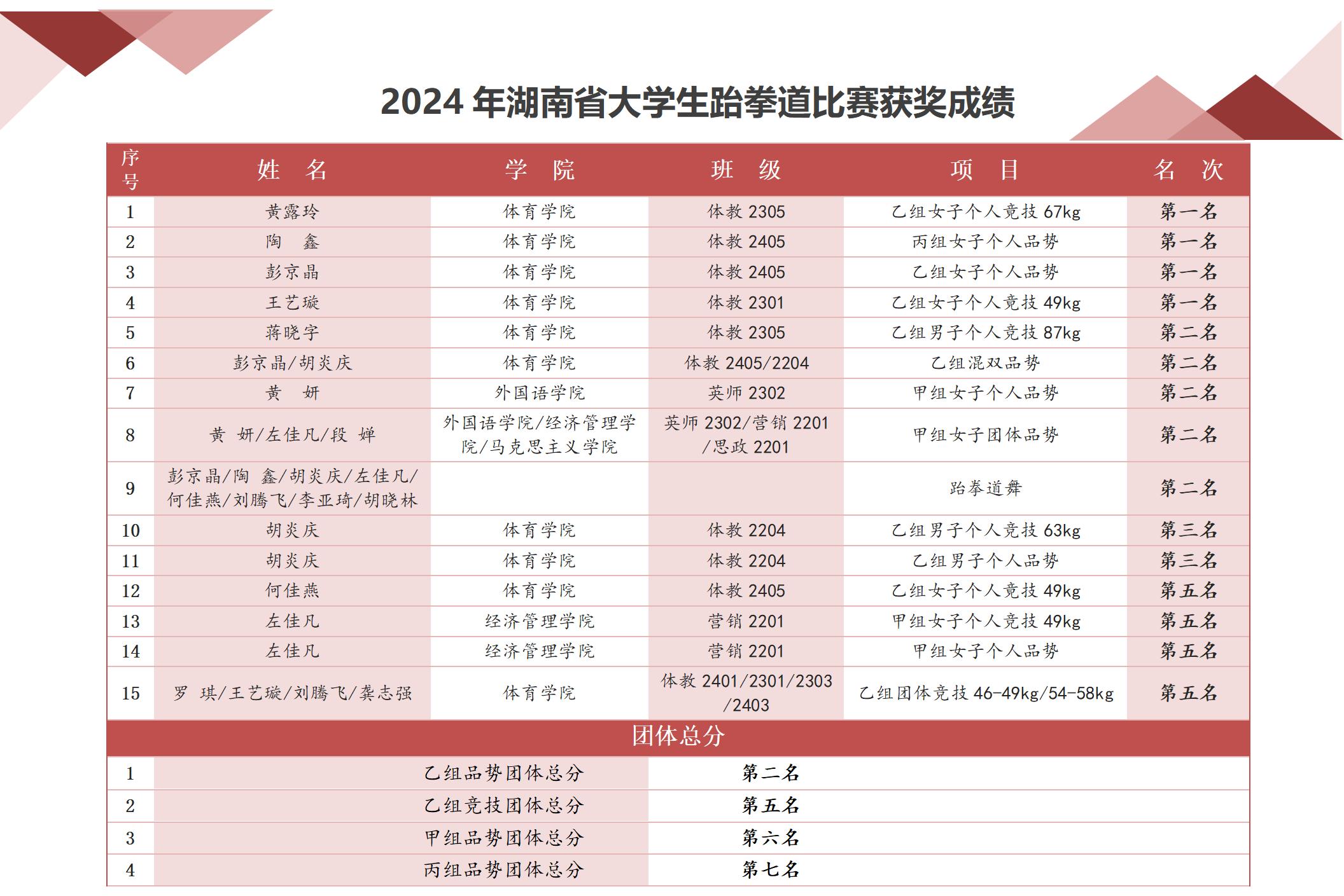 赛场上,世界杯官网共派出16名运动员参与了15个项目的角逐,最终斩获4金5银2铜的优异成绩。其中体育学院黄露玲、陶鑫、彭京晶、王艺璇等同学在个人项目中脱颖而出,分别夺得乙组女子个人竞技和品势项目的冠军。团体项目中,世界杯官网学子同样表现出色,由外国语学院黄妍、经济与管理学院左佳凡、马克思主义学院段婵等三位同学组成的甲组女子团体品势,凭借默契的配合和精湛的技艺,获得了全省第二名的好成绩。