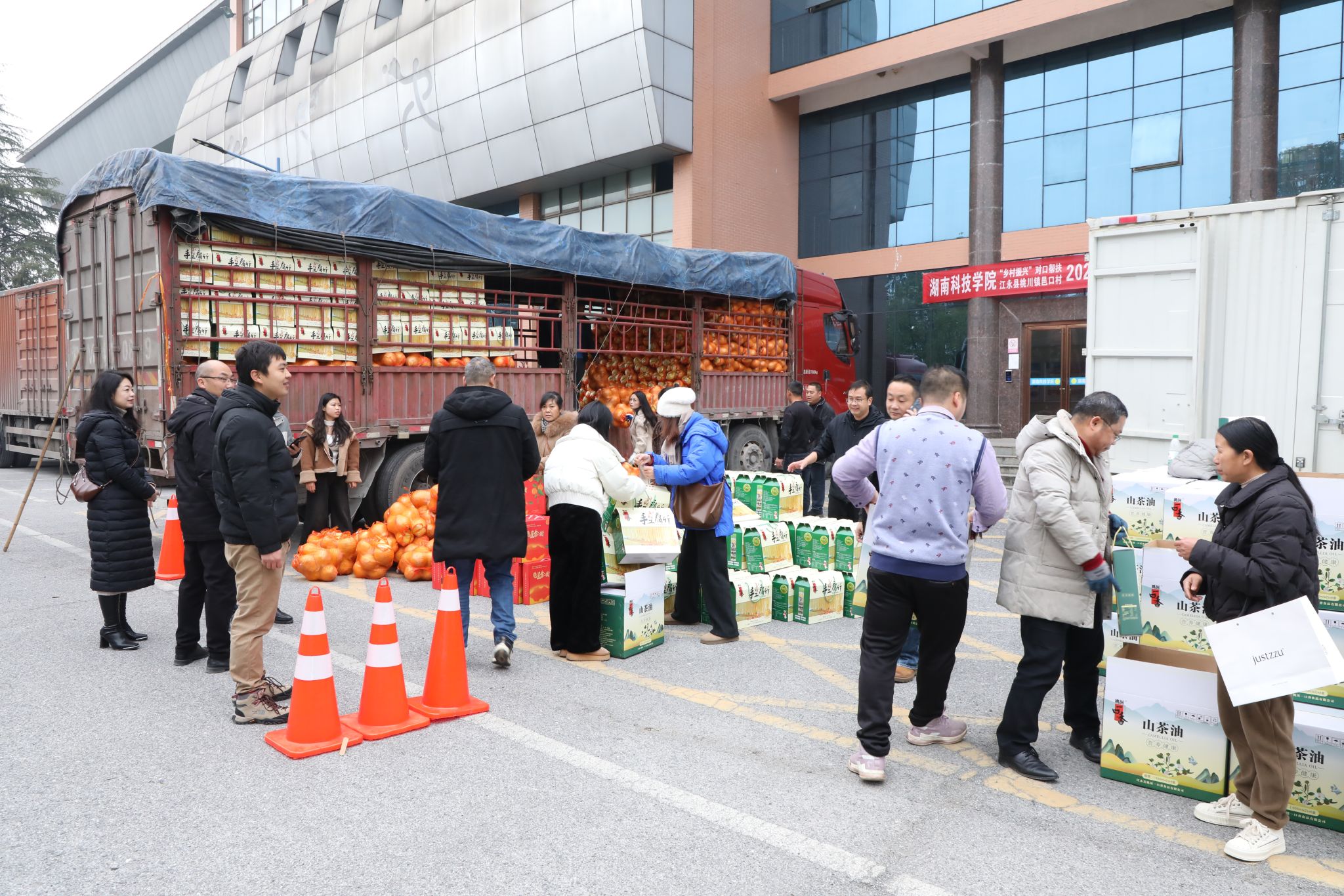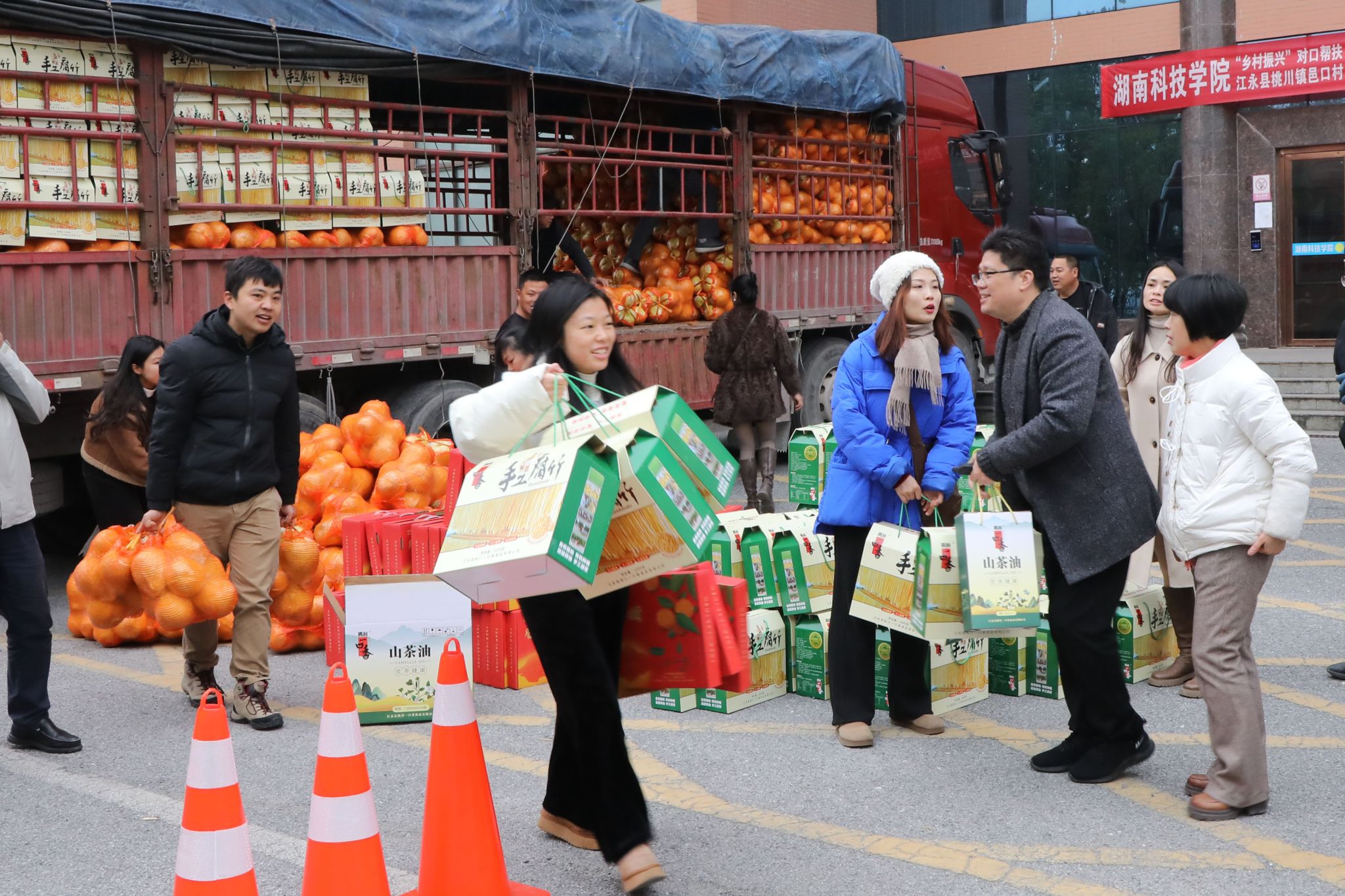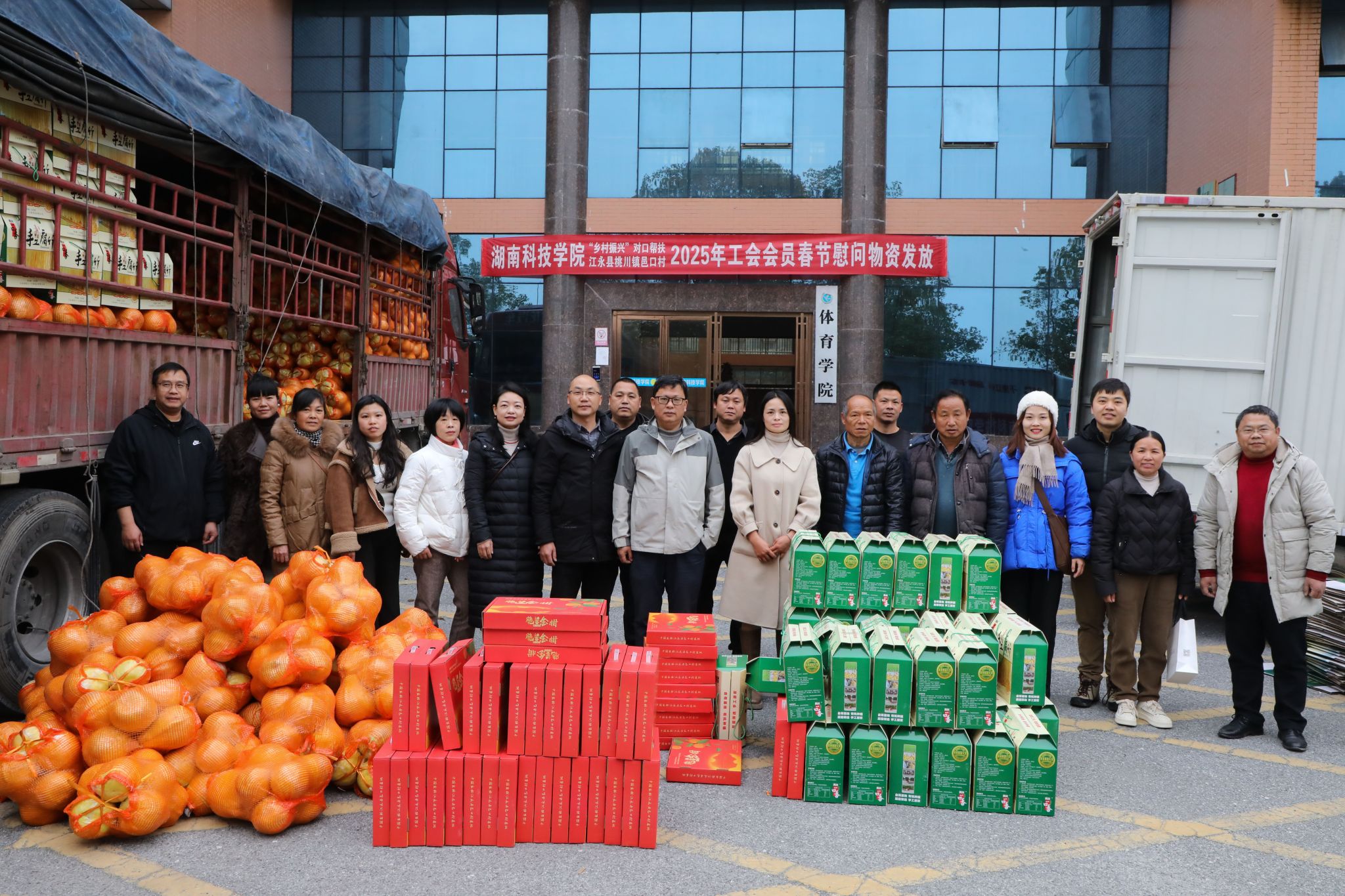 本网讯(通讯员 刘子奇)12月30日上午,学校在训练馆前开展乡村振兴对口帮扶邑口村2025年教职工春节慰问物资发放活动,为教职工送去新年的祝福。