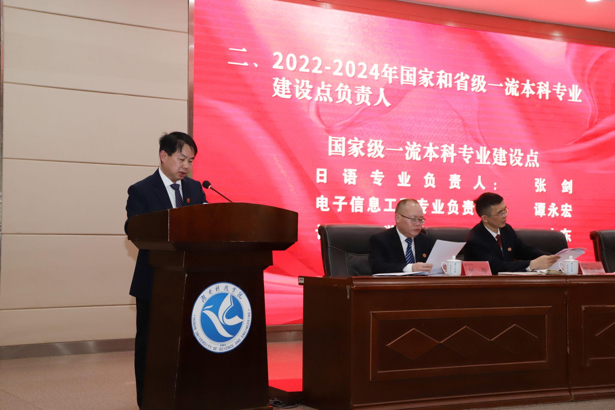 国家级一流本科专业建设点计算机科学与技术专业教师代表尹向东,国家级一流本科课程《大学英语》主讲教师胡维,湖南省教学创新大赛一等奖获奖教师廖春艳,全国大学生机械创新设计大赛一等奖指导教师罗哲先后发言。
