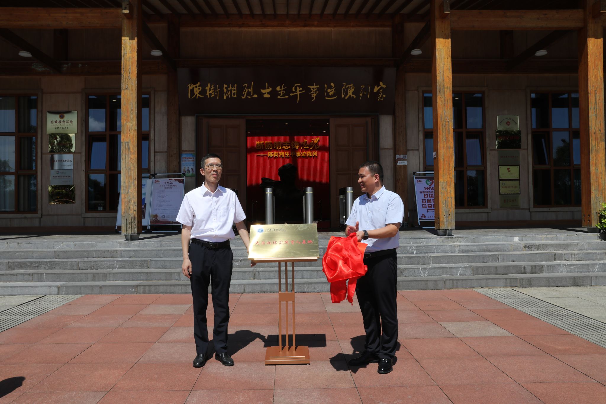 本网讯(通讯员 盘洪卓)7月3日,学校“大思政课实践育人基地”揭牌仪式在陈树湘红色文化园举行。校党委委员、纪委书记陈灿军,道县县委常委、宣传部部长唐华豪,陈树湘烈士纪念馆党组书记、馆长朱江民等领导出席仪式,仪式由朱江民主持。