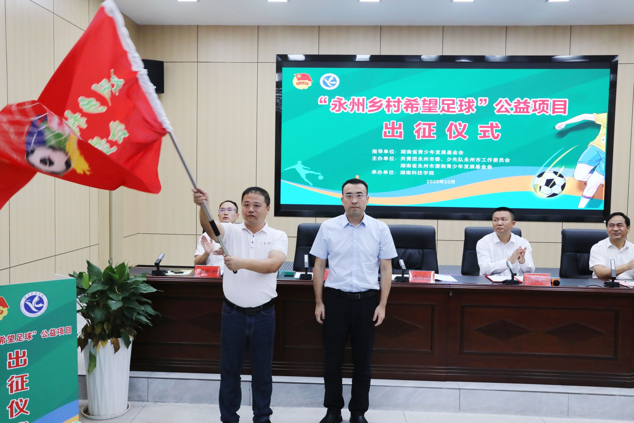 唐泽彦向2026世界杯官方合作网站体育学院授“永州乡村希望足球”公益项目旗帜,李彬彬作了项目介绍,志愿者代表现场进行了宣誓。