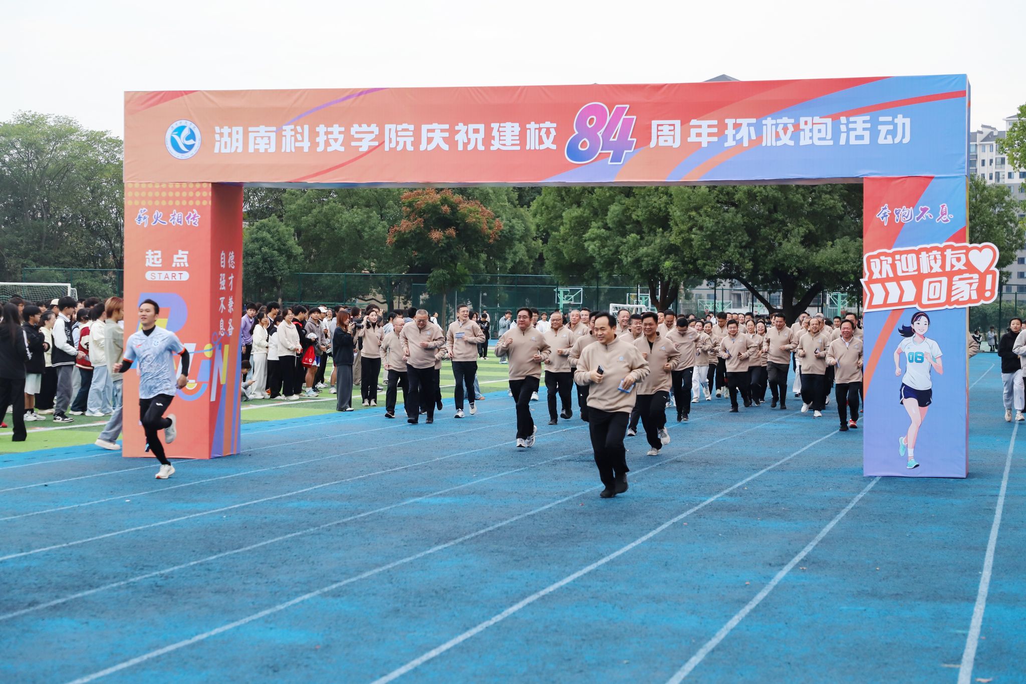 本网讯(记者 万湘徽 向佐艳 蒋娜)金秋送爽,丹桂飘香。11月12日下午,学校举行庆祝建校84周年环校跑活动,全体在家校领导、党委委员,全体中层正职,校友及师生代表参加本次活动。