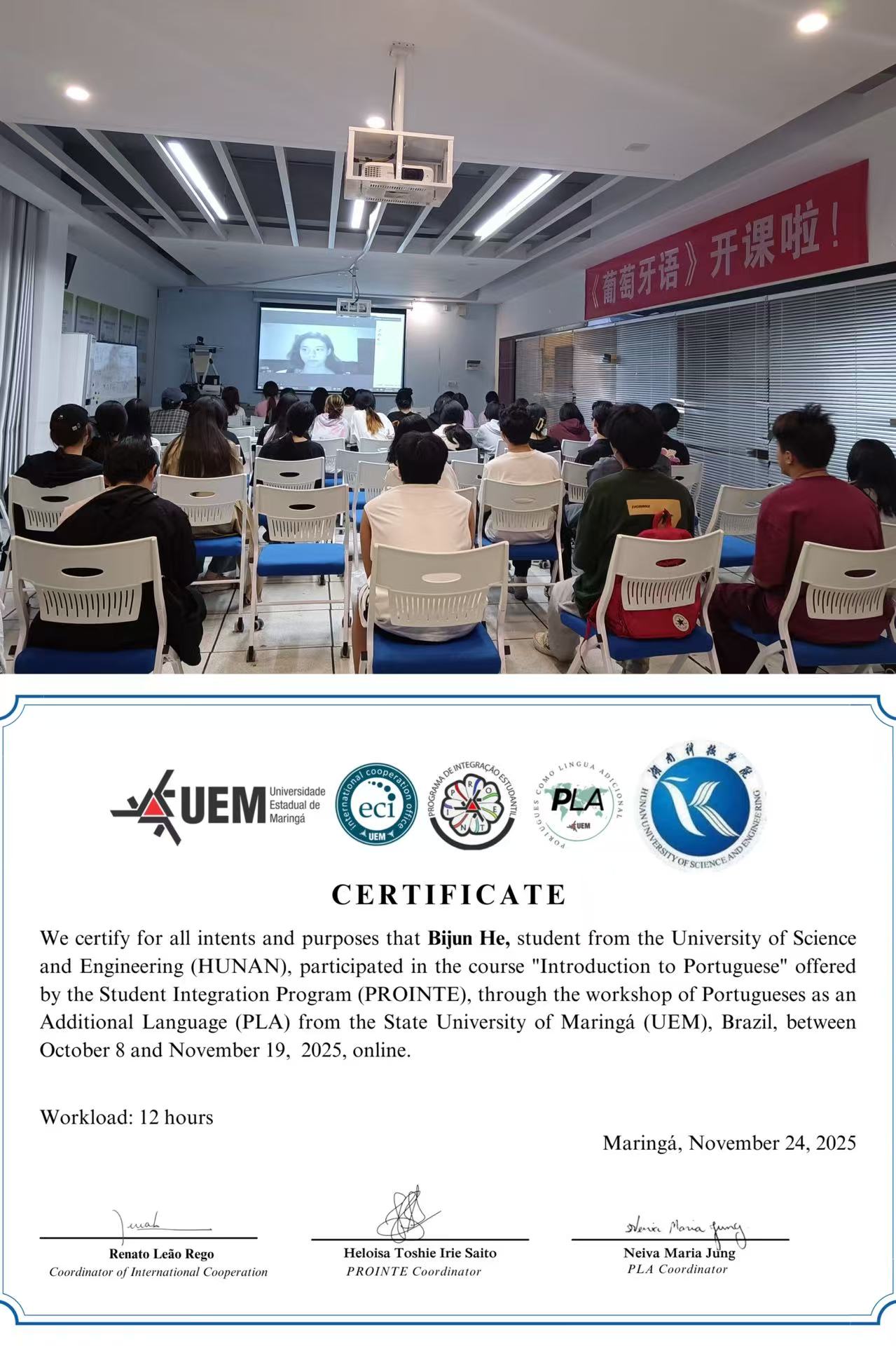 2024年3月,以课程置换模式与巴西马林加州立大学实现了教学资源互通,将外方优质葡萄牙语言文化课程纳入全校公选课体系,惠及校内12个教学学院及巴方百余名师生。