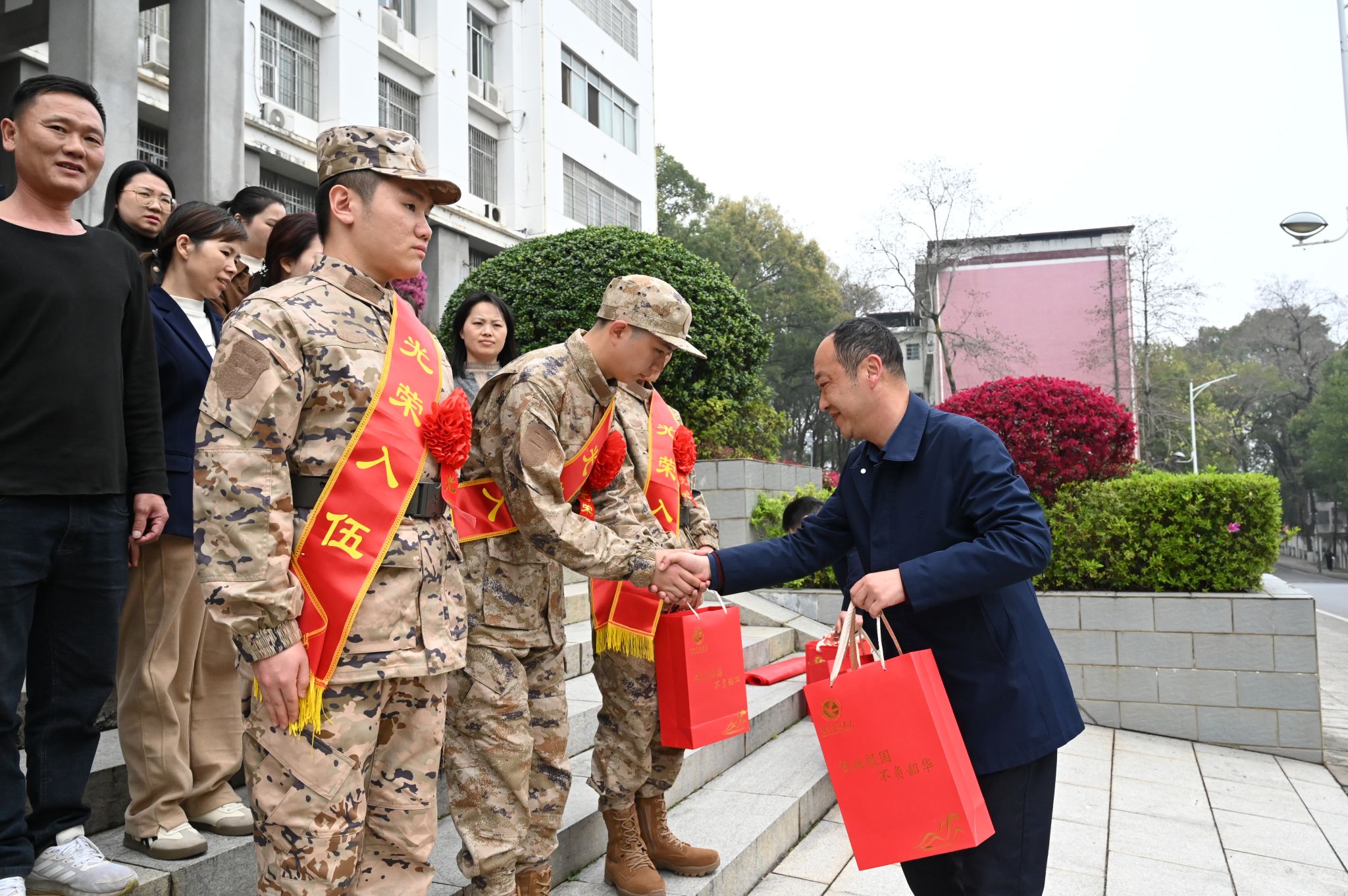 杨涛代表学校向光荣入伍的全体新兵表示热烈祝贺,为入伍新兵披绶带、戴红花、赠送入伍纪念品,将母校的关怀与希望送到每一位新兵手中,同时向情系国防、送子参军的家长们致以崇高敬意,向奋战在征兵工作一线的师生员工表示衷心感谢。他还对入伍新兵提出三点期望:一要筑牢忠诚军魂,坚定不移听党话、跟党走,快速完成从校园学子到革命军人的角色转变,争做“有灵魂、有本事、有血性、有品德”的新时代军人;二要锤炼过硬本领,严守部队纪律、刻苦军事训练,发扬科院人吃苦耐劳、奋勇争先的优良作风,在军营大熔炉里淬炼成钢;三要勇担时代使命,把个人青春理想融入强军梦、中国梦,以实际行动为国防和军队现代化建设贡献力量,为家乡争光、为母校添彩。