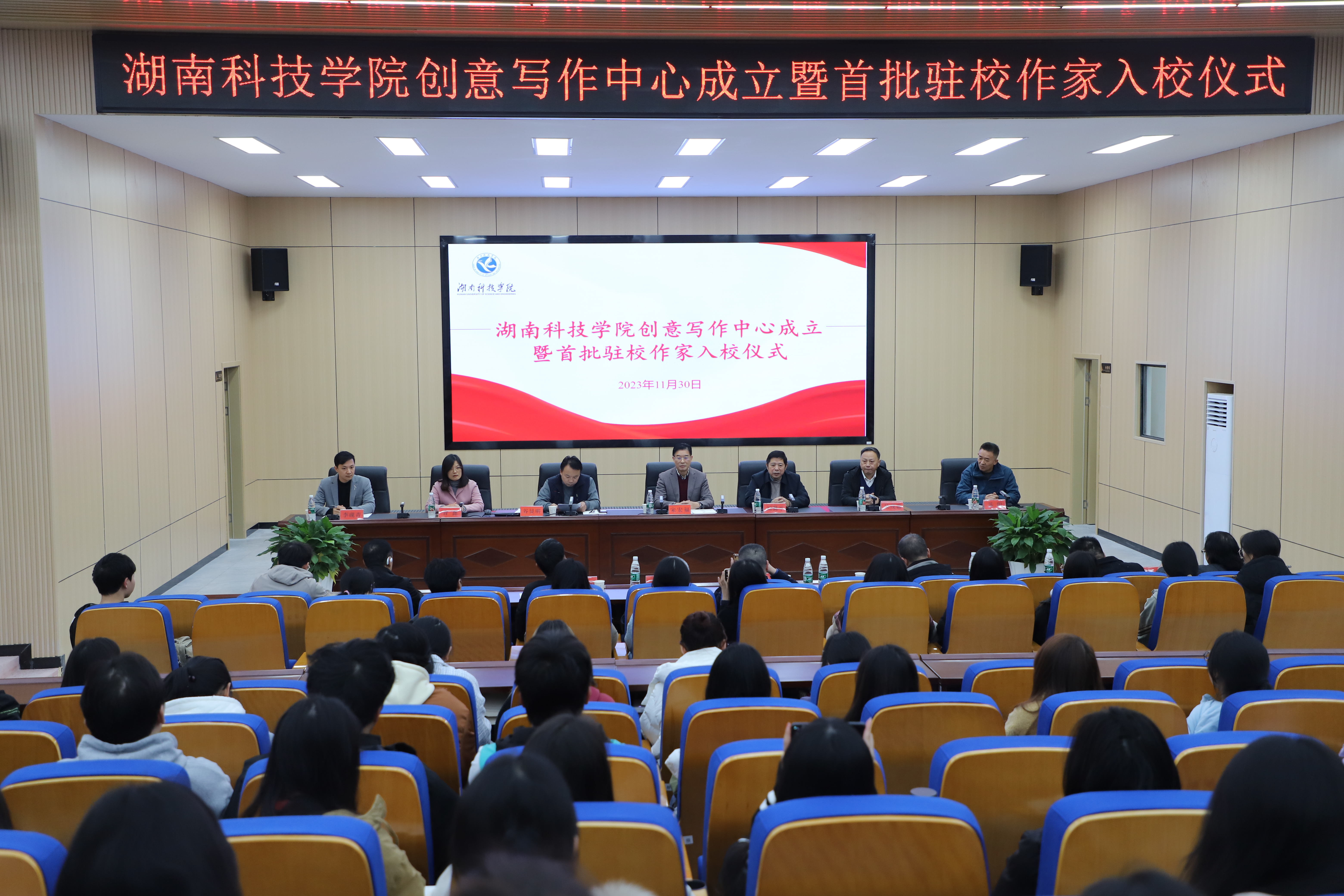 本网讯 12月1日,学校创意写作中心成立暨首任驻校作家入校仪式举行。党委副书记宋宏福,永州市文联党组书记、主席、中国散文学会理事刘翼平,文法学院院长谷显明、永州市评论家协会主席刘忠华、永州市作家协会副主席王敦权、魏佳敏等,以及汉语言文学、秘书学专业学生、西山文学社社员等100余人参加活动。聘任知名作家吴茂盛、青蓖、苏阳、李砚青为首任驻校作家。