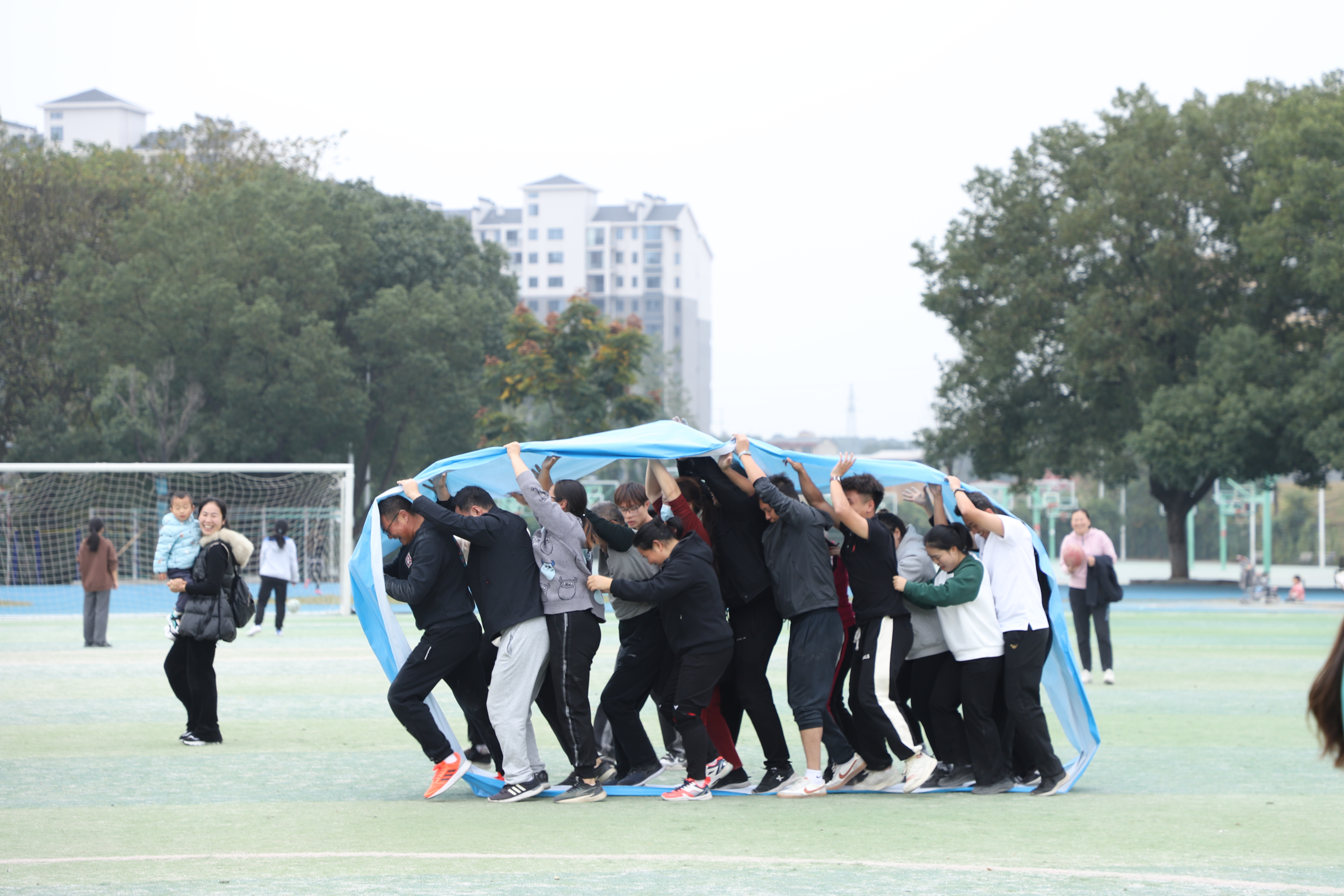 “不要急,稳一点,慢慢来”“干得漂亮!”“把握节奏”……现场气氛热烈,队员们个个铆足了劲,涨红了脸,全力以赴,一旁的啦啦队为上阵队员加油鼓劲,笑声、欢呼声、呐喊声回荡在田径场上空。