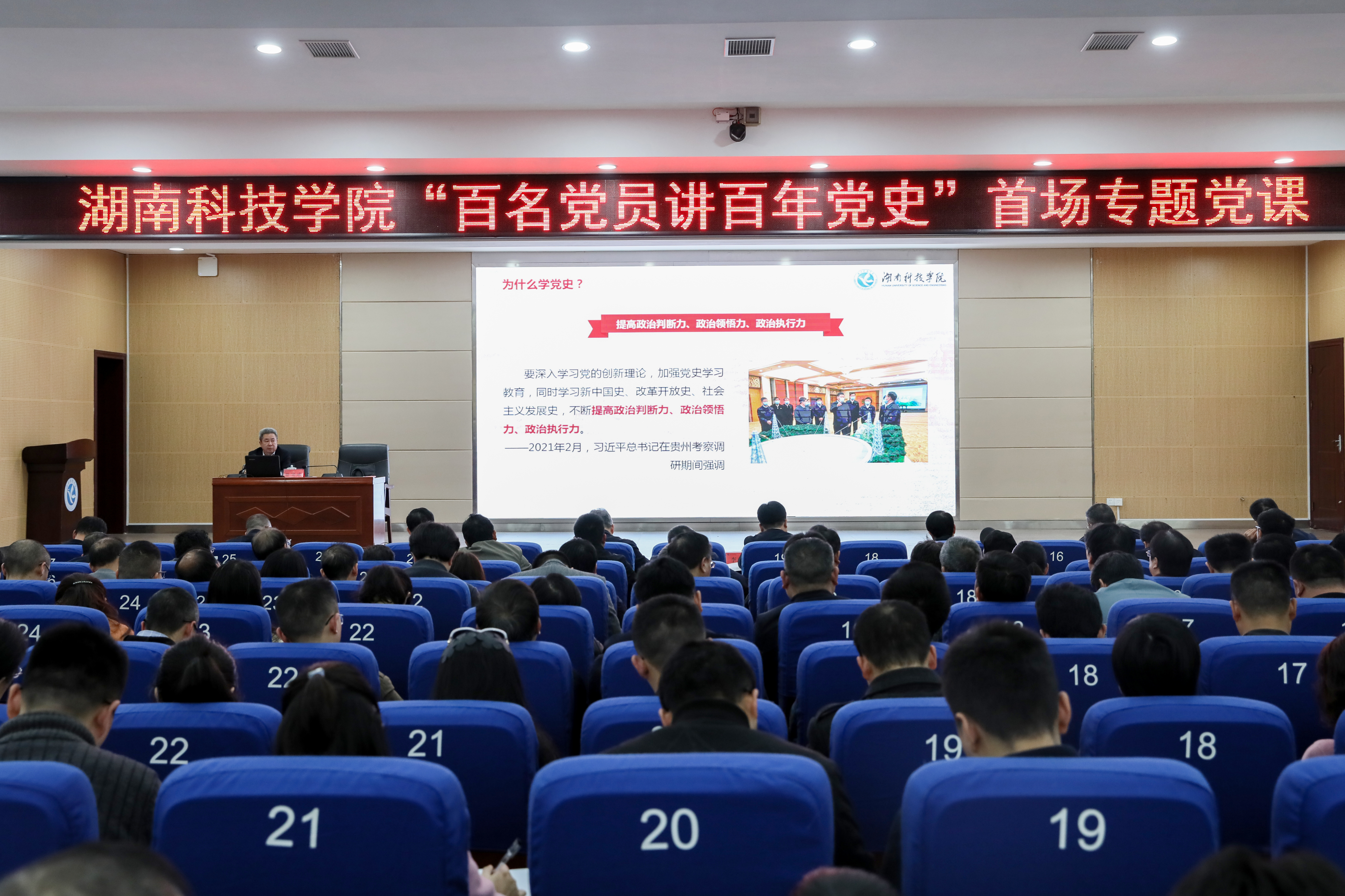 本网讯 “2021年是中国农历辛丑年,120年前的1901年,也是辛丑年。两个甲子轮回,历史与现实交错下,是站在世界外交舞台上,焕然一新的中国与中国人。”3月25日下午,党委书记、党史学习教育领导小组组长曾宝成作为学校“百名党员讲百年党史”首场主讲人,声情并茂地向大家讲述了“学史明理:从百年党史中汲取奋进力量”这一主题。党委领导班子成员、全体中层干部、各基层党支部书记、党员代表到场聆听。