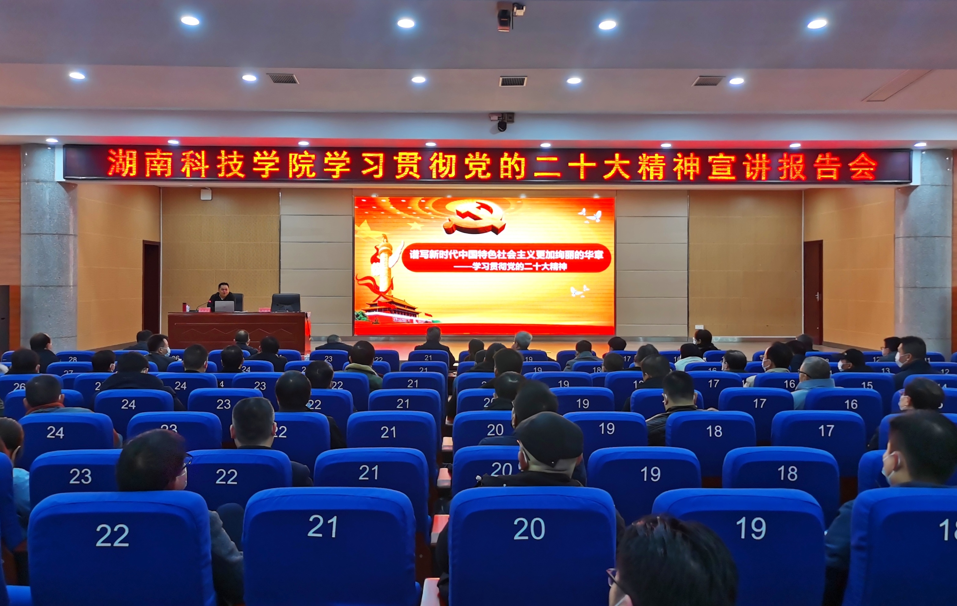 汤建军从全面领会党的二十大的主题及主要成果、深刻认识新时代十年的伟大变革及其里程碑意义、不断开辟马克思主义中国化时代化新境界、牢牢把握新时代新征程中国共产党的使命任务、贯彻落实新时代新征程的战略部署、用新的伟大奋斗创造新的伟业等方面,对党的二十大精神进行了系统阐释和深入解读。与会人员仔细聆听、认真记录,认为宣讲报告紧扣实际、内容丰富,听后深受启发。