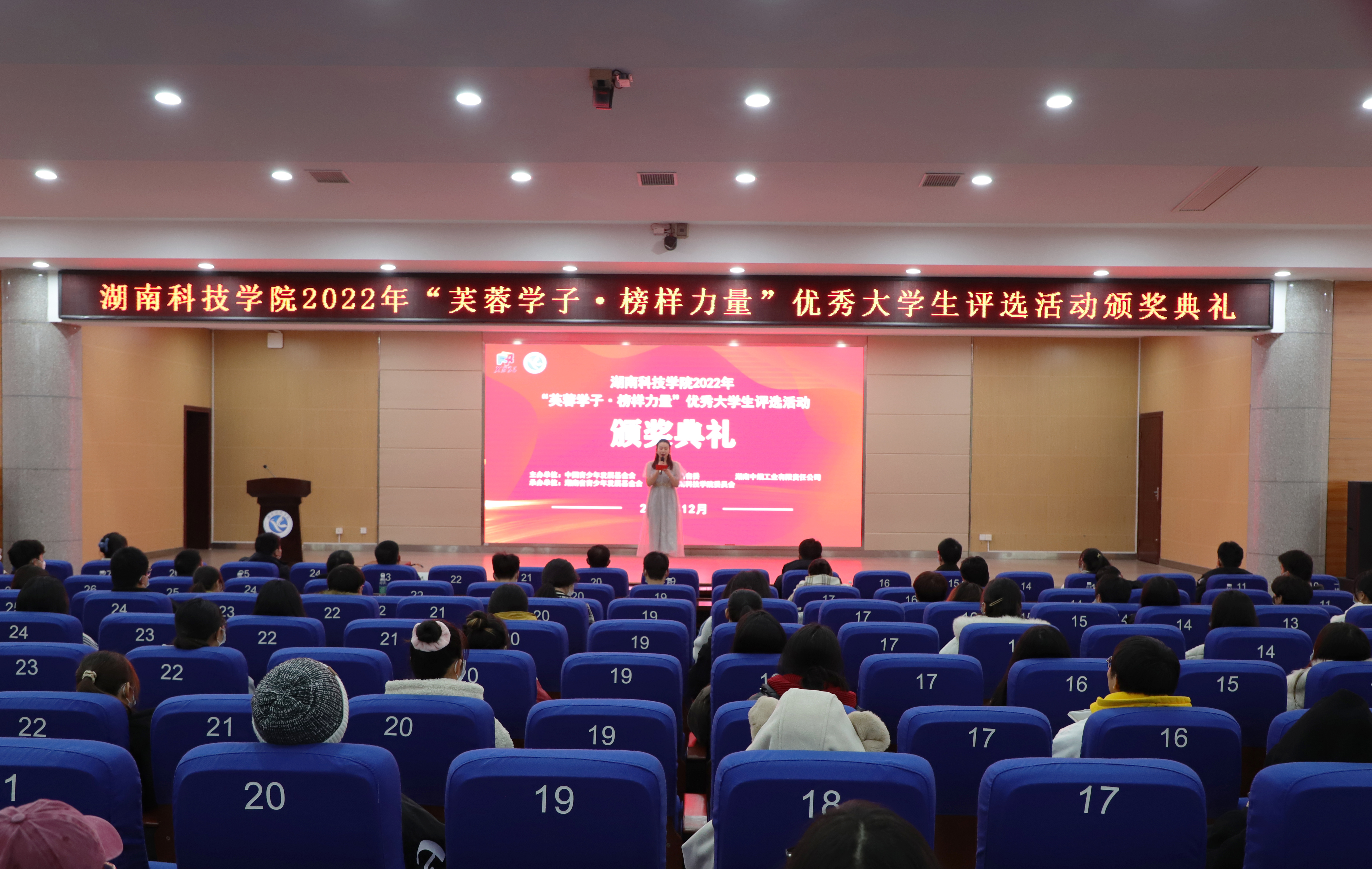 本网讯(通讯员 杨凯翔 张湘君)12月11日晚,学校第十七届“芙蓉学子·榜样力量”优秀大学生颁奖典礼在潇湘大讲堂举行。校党委委员、副校长吴小林,学工部部长谷利民、校团委书记万李以及各教学学院团总支书记和学生代表参加活动。