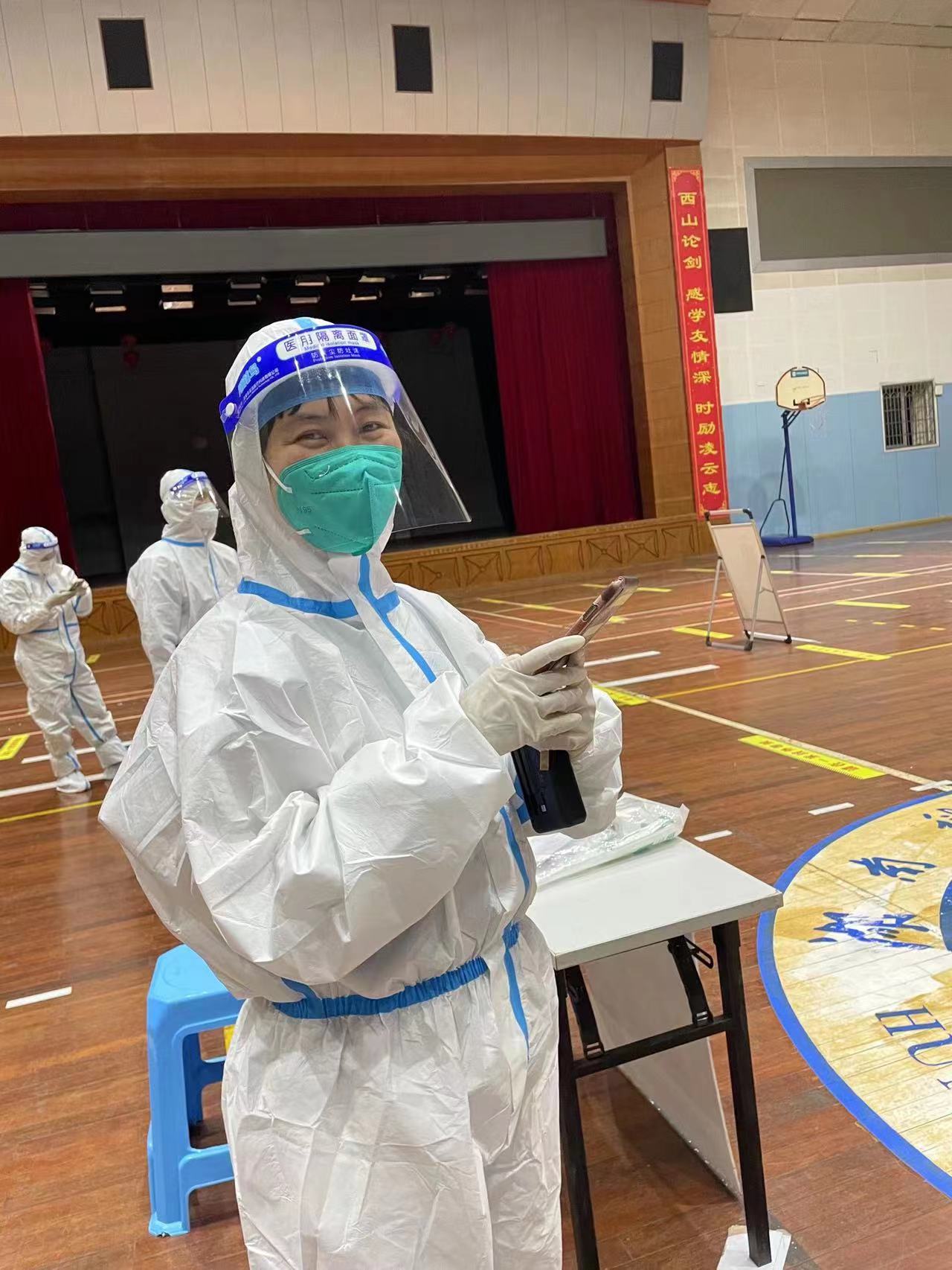在检测现场长时间身穿防护服,中途不能喝水、上厕所,工作时口罩里的哈气在面屏上会结上厚厚的水气,但唐维并没有被困难的工作条件打败,她不仅高效地完成自己的工作还援助其他楼栋工作,如:人员引导、秩序维护、协助样品采集等。