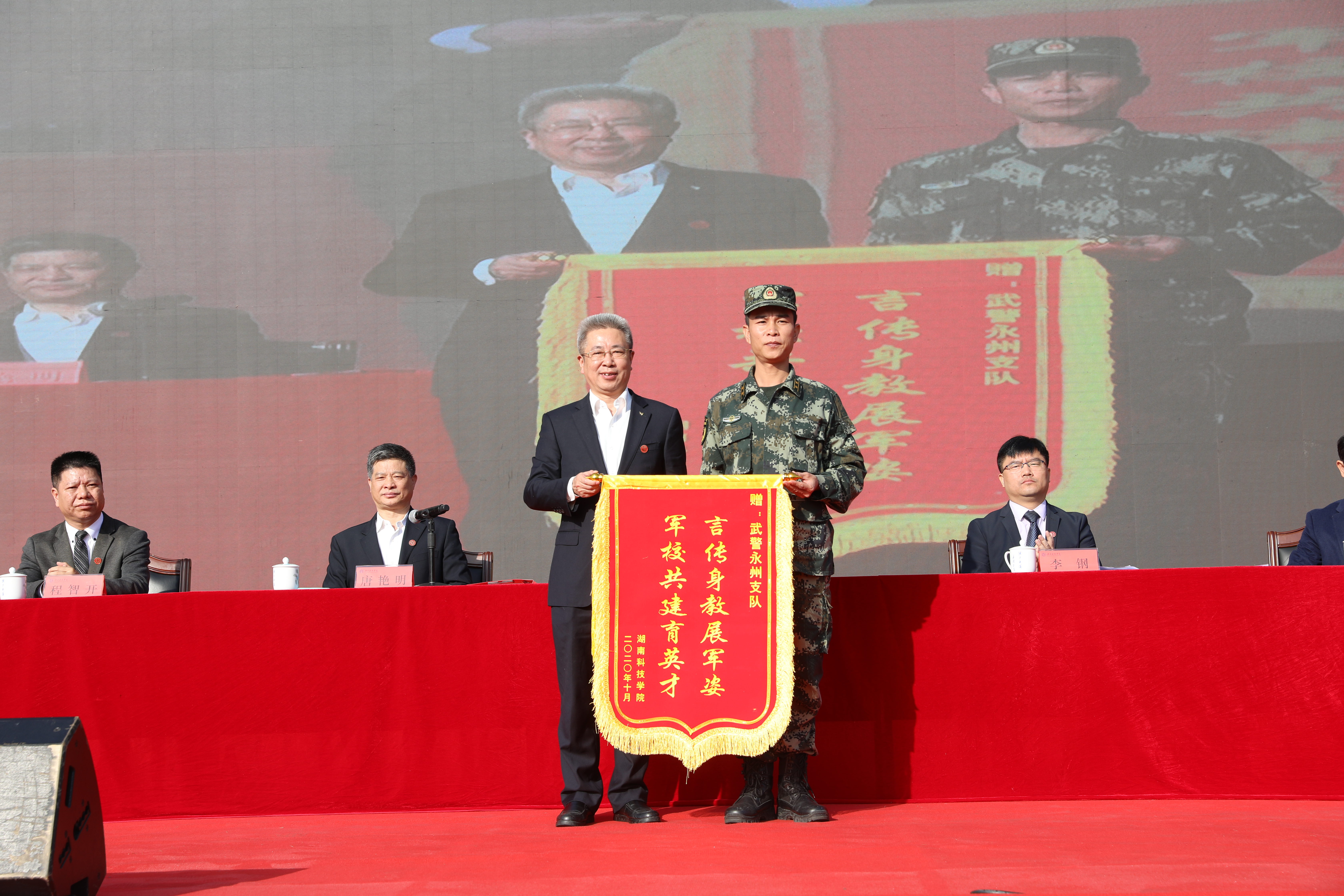 曾宝成向武警永州支队军训教官赠送锦旗。