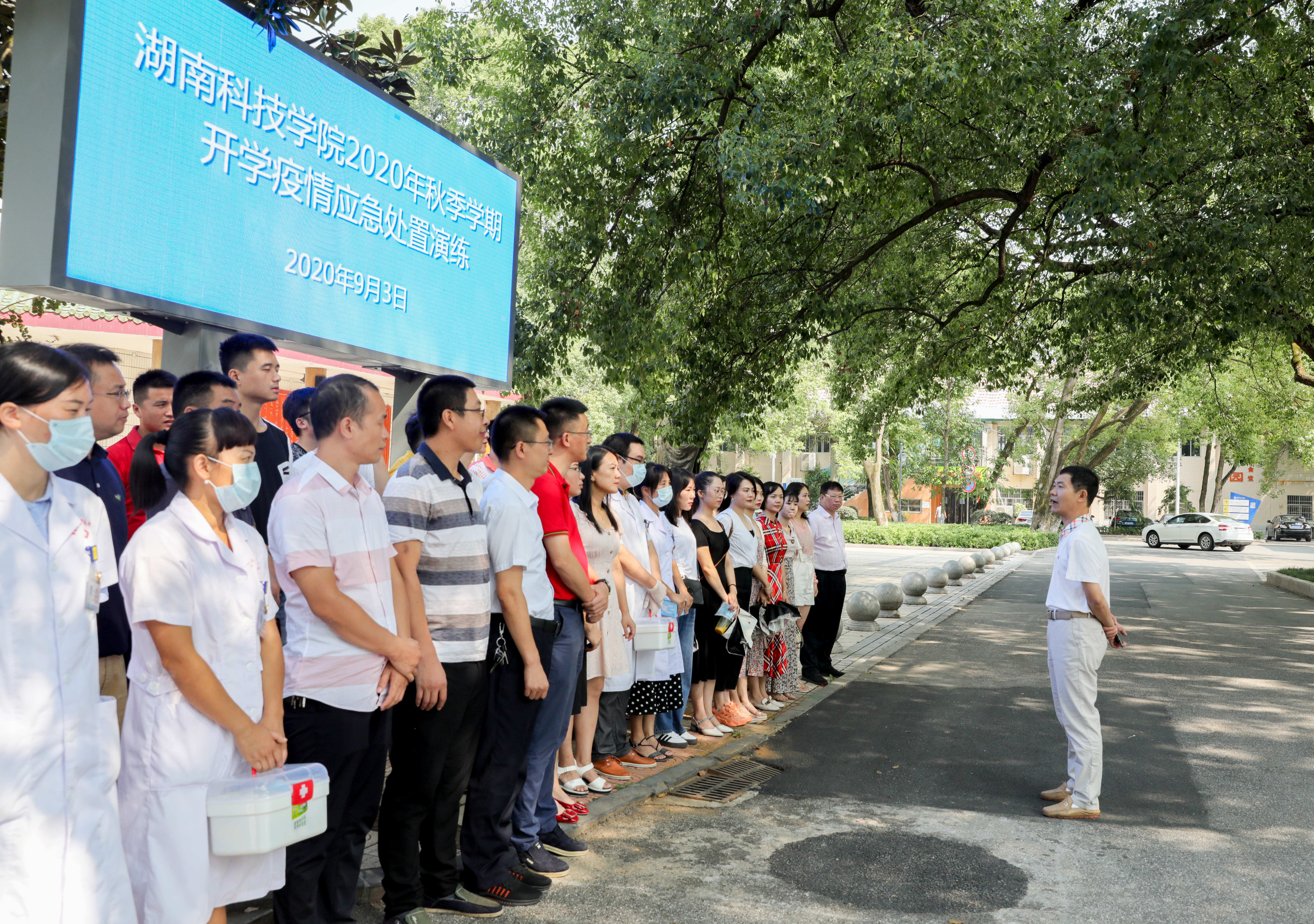 本网讯 9月3日上午,学校举行秋季学期开学疫情应急处置演练,全程、全方位模拟学生返校当天及返校后在校期间的日常学习、生活等相关工作流程,以及学生出现发热和可疑症状时应急处置。副校长吴小林到场观摩指导。