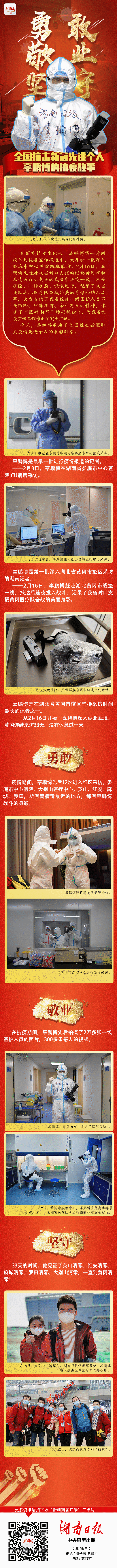 新冠肺炎疫情发生以来,辜鹏博不畏艰险,冲锋在前,第一时间投入到抗疫宣传报道中,深入一线连续采访33天,先后拍摄了2万多张一线医护人员的照片,300多条感人的视频,为我省抗疫宣传工作作出了突出贡献。